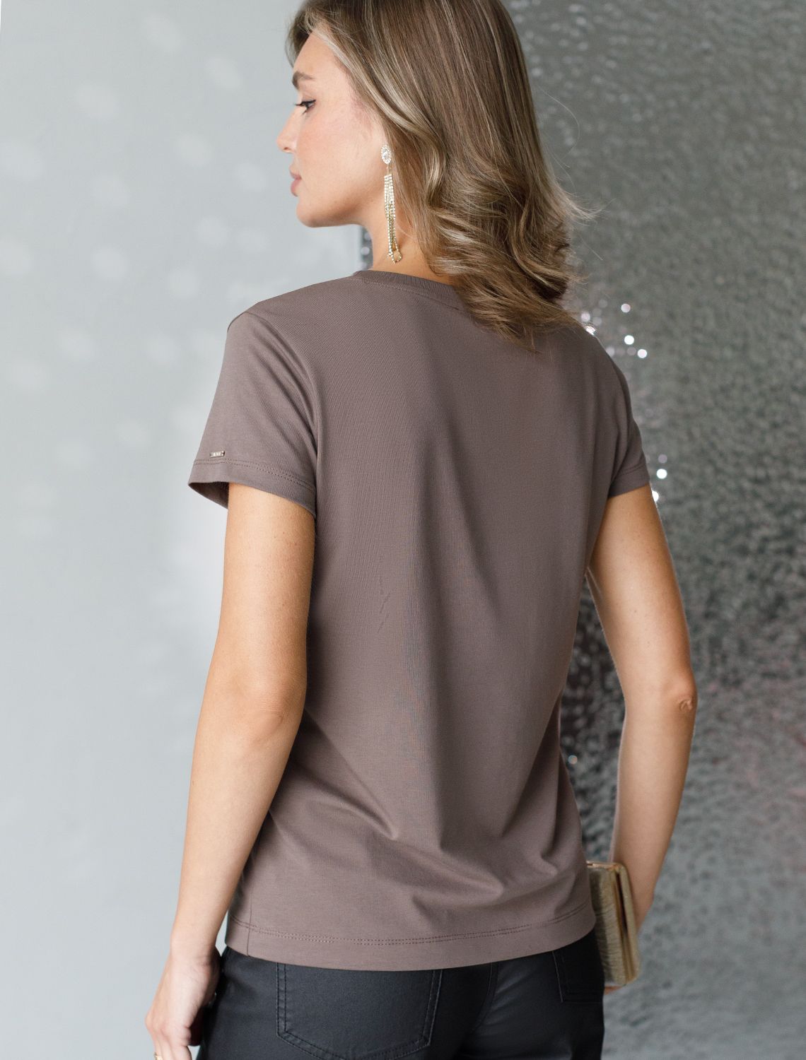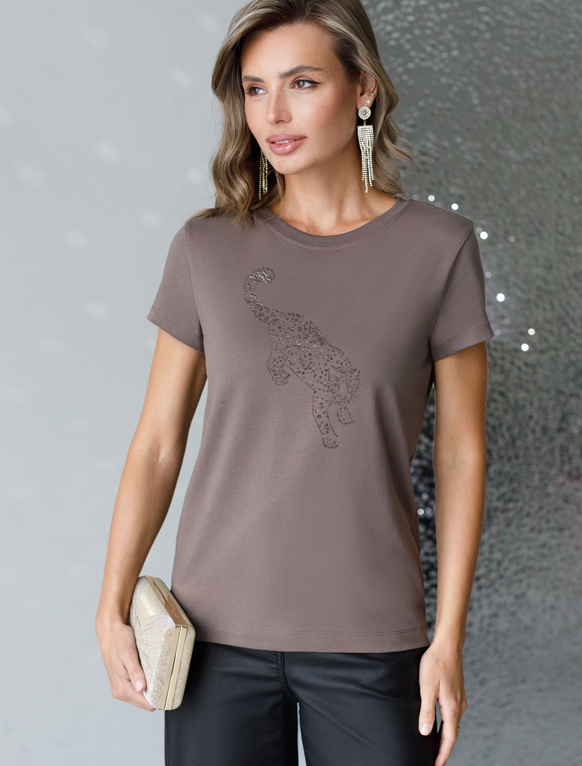 Стильная базовая футболка кофейного цвета с серебристым принтом фольгой выполнена из плотного хлопка с эластаном для комфортной посадки на любую фигуру. Прямая футболка классического кроя с круглым вырезом, прекрасно подходит для разных типов фигуры, в том числе и на большие размеры. Мягкость хлопка вместе с небольшой долей эластана гарантирует идеальную посадку и свободу движений. Легкая натуральная дышащая ткань премиального качества делает футболку с коротким рукавом идеальным вариантом для повседневной носки дома, на работу или офис. Однотонная футболка дополнена авторским аккуратным принтом с изображением леопарда, который придает праздничный и элегантный вид без лишней вычурности. Блестящий анималистичный принт аккуратно украшает, добавляя изысканный акцент и создавая легкий мерцающий эффект.
