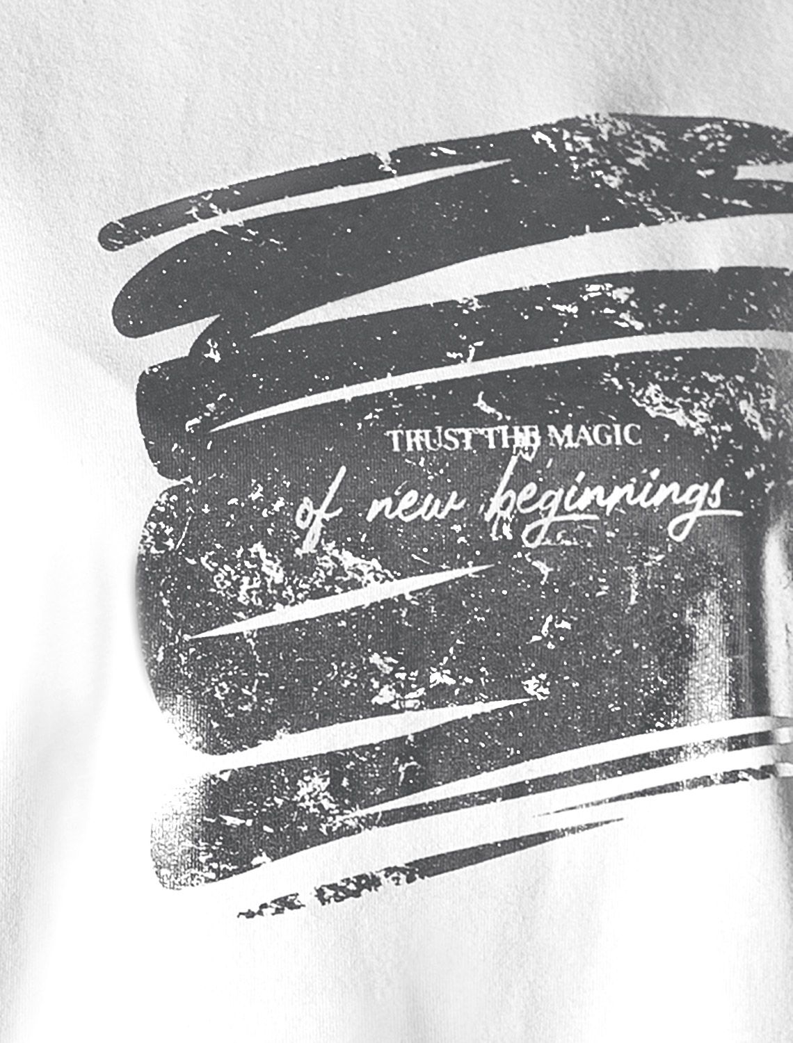 Стильная базовая футболка белого цвета с серебристым принтом фольгой выполнена из плотного хлопка с эластаном для комфортной посадки на любую фигуру. Прямая футболка классического кроя с круглым вырезом, прекрасно подходит для разных типов фигуры, в том числе и на большие размеры. Мягкость хлопка вместе с небольшой долей эластана гарантирует идеальную посадку и свободу движений. Легкая натуральная дышащая ткань премиального качества делает футболку с коротким рукавом идеальным вариантом для повседневной носки дома, на работу или офис. Однотонная футболка дополнена авторским аккуратным принтом с минималистичной надписью, который придает праздничный и элегантный вид без лишней вычурности. Блестящий принт аккуратно украшает, добавляя изысканный акцент и создавая легкий мерцающий эффект. Перевод надписи Trust the magic of new beginnings - Доверьтесь магии новых начинаний.