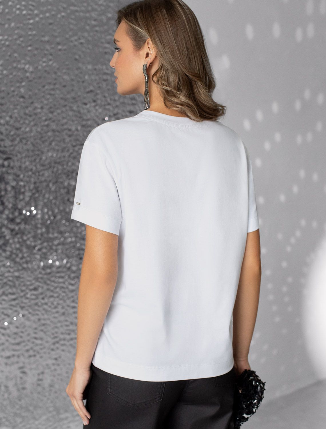 Стильная базовая футболка белого цвета с серебристым принтом пайетками выполнена из плотного хлопка с эластаном для комфортной посадки на любую фигуру. Прямая футболка классического кроя с круглым вырезом, прекрасно подходит для разных типов фигуры, в том числе и на большие размеры. Мягкость хлопка вместе с небольшой долей эластана гарантирует идеальную посадку и свободу движений. Легкая натуральная дышащая ткань премиального качества делает футболку с коротким рукавом идеальным вариантом для повседневной носки дома, на работу или офис. Однотонная футболка дополнена авторским аккуратным принтом зебра, который придает праздничный и элегантный вид без лишней вычурности. Блестящий анималистичный принт аккуратно украшает, добавляя изысканный акцент и создавая легкий мерцающий эффект.