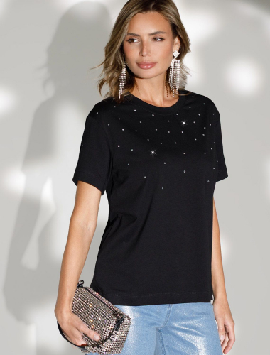 Стильная базовая футболка черного цвета с принтом стразами выполнена из плотного хлопка с эластаном для комфортной посадки на любую фигуру. Прямая футболка классического кроя с круглым вырезом, прекрасно подходит для разных типов фигуры, в том числе и на большие размеры. Мягкость хлопка вместе с небольшой долей эластана гарантирует идеальную посадку и свободу движений. Легкая натуральная дышащая ткань премиального качества делает футболку с коротким рукавом идеальным вариантом для повседневной носки дома, на работу или офис. Однотонная футболка дополнена авторским аккуратным принтом, который придает праздничный и элегантный вид без лишней вычурности. Блестящий принт в виде россыпи страз аккуратно украшает, добавляя изысканный акцент и создавая легкий мерцающий эффект.