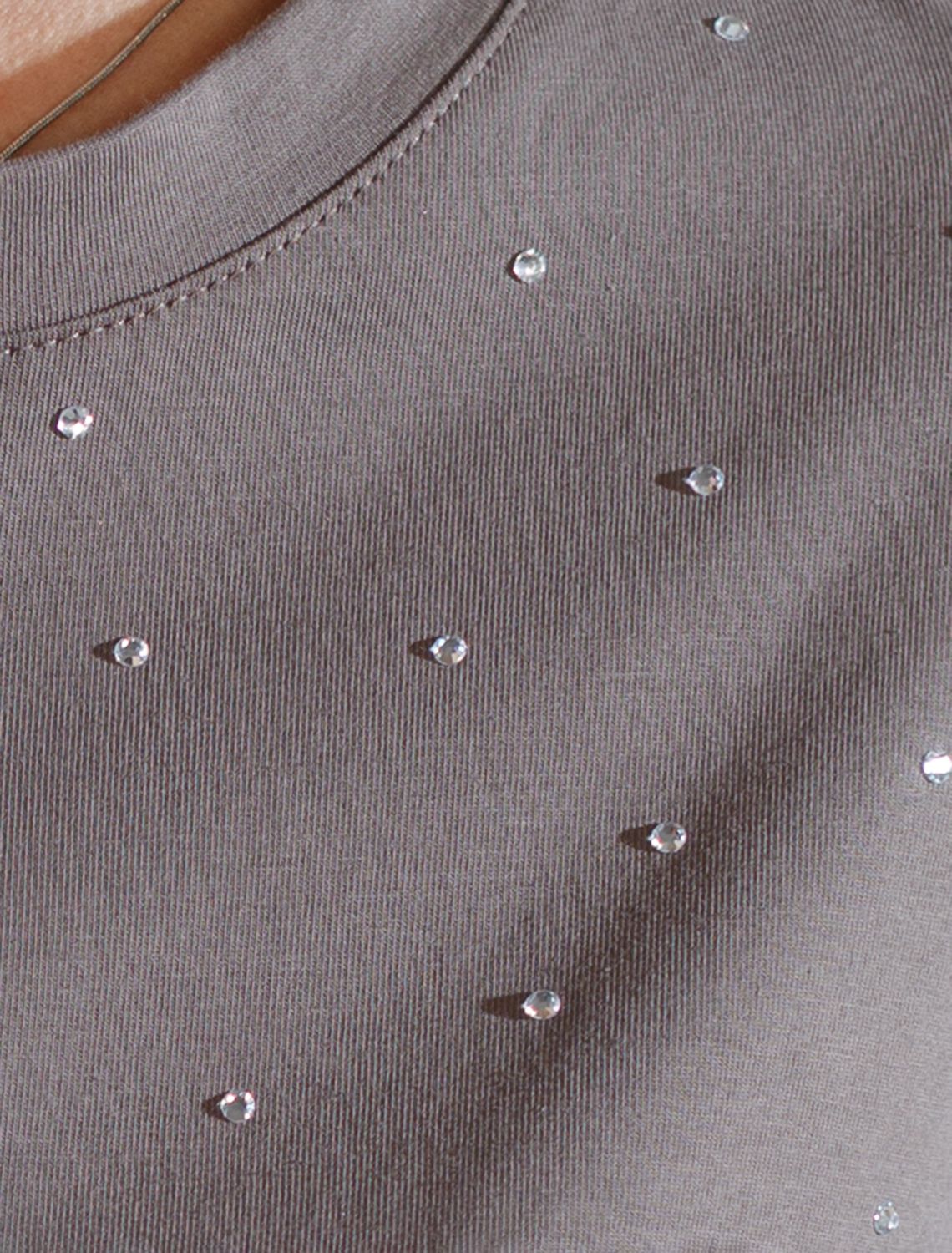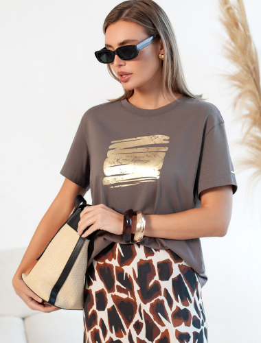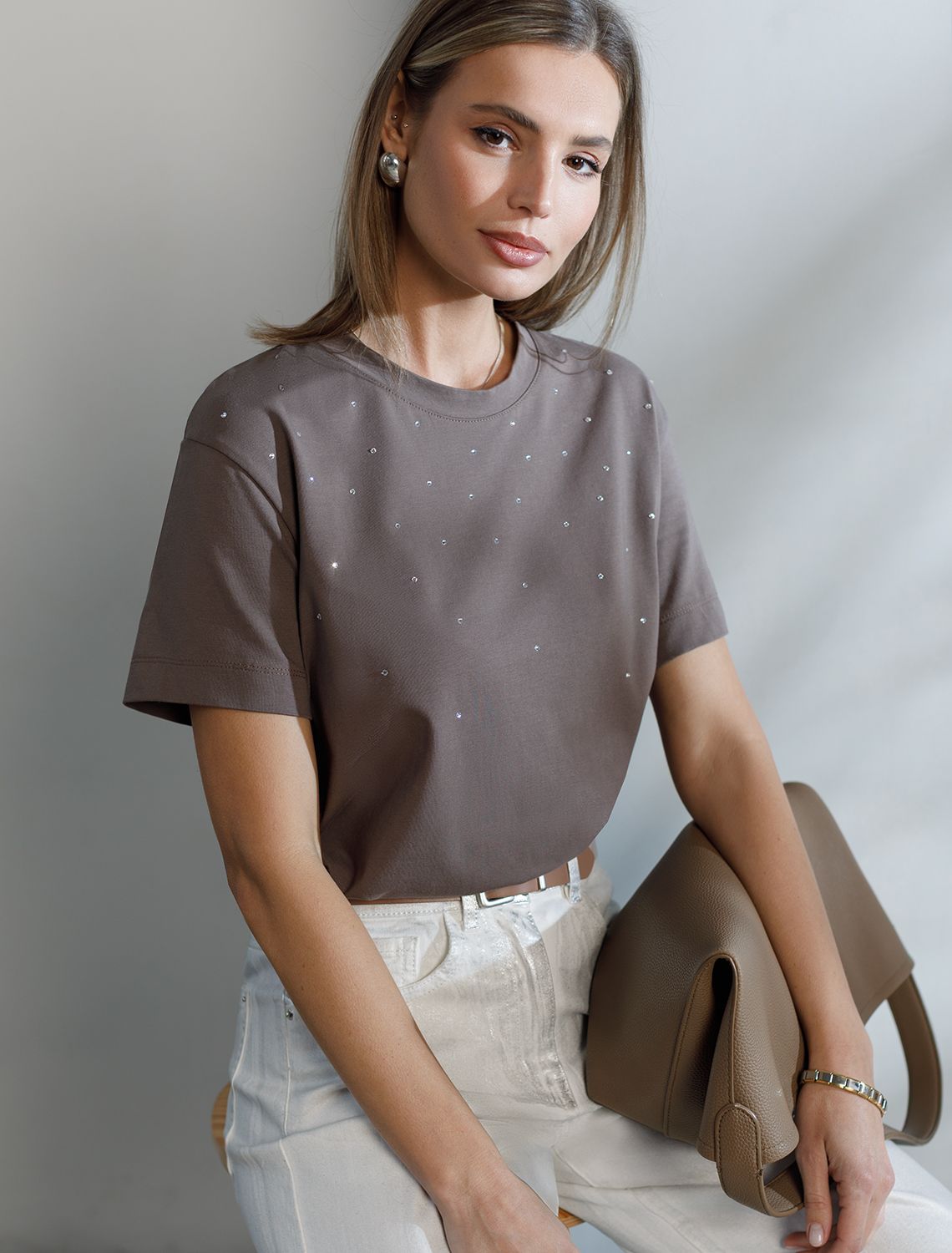 Стильная базовая футболка кофейного цвета с принтом стразами выполнена из плотного хлопка с эластаном для комфортной посадки на любую фигуру. Прямая футболка классического кроя с круглым вырезом, прекрасно подходит для разных типов фигуры, в том числе и на большие размеры. Мягкость хлопка вместе с небольшой долей эластана гарантирует идеальную посадку и свободу движений. Легкая натуральная дышащая ткань премиального качества делает футболку с коротким рукавом идеальным вариантом для повседневной носки дома, на работу или офис. Однотонная футболка дополнена авторским аккуратным принтом, который придает праздничный и элегантный вид без лишней вычурности. Блестящий принт в виде россыпи страз аккуратно украшает, добавляя изысканный акцент и создавая легкий мерцающий эффект.