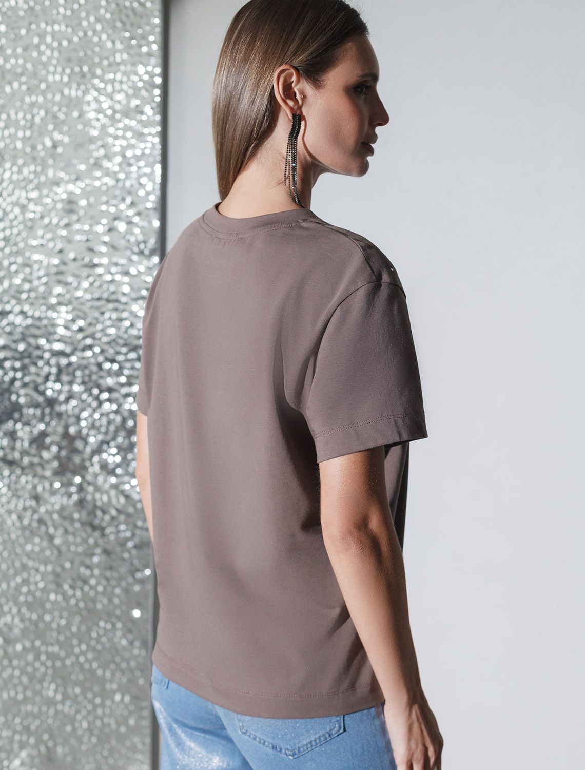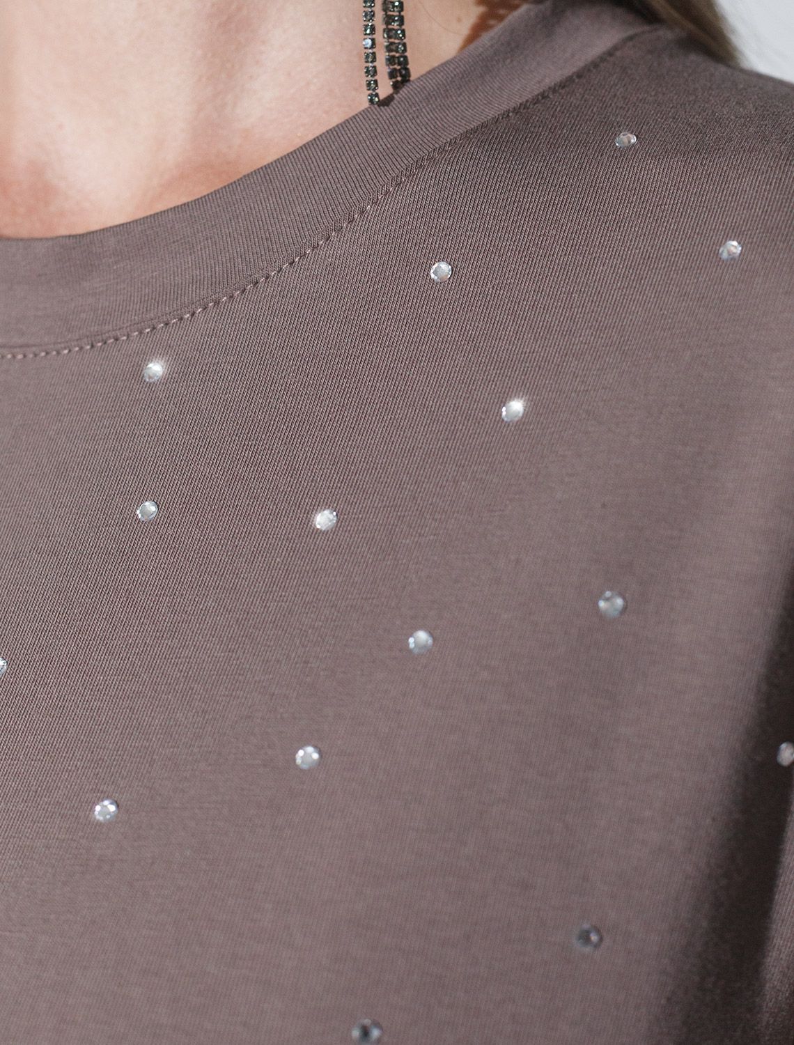 Нарядная футболка с принтом стразами из премиального хлопка с эластаном D49.124 кофе_стразы