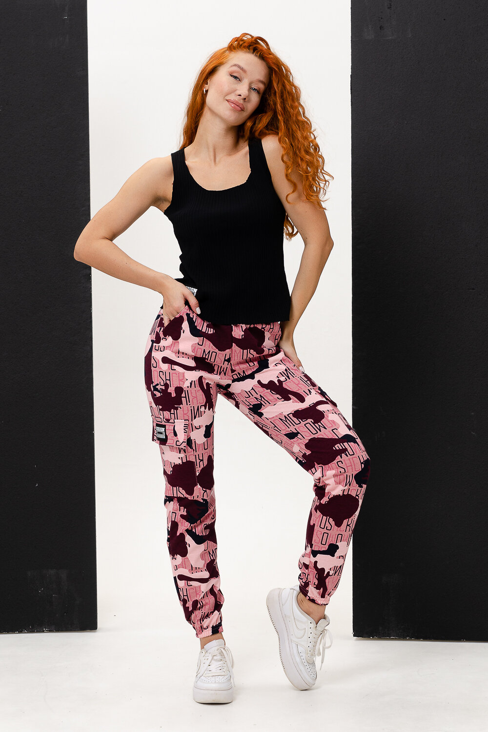Брюки на поясе, с боковыми карманами вверху, накладными карманами с клапаном по бокам, внизу на резинке.
