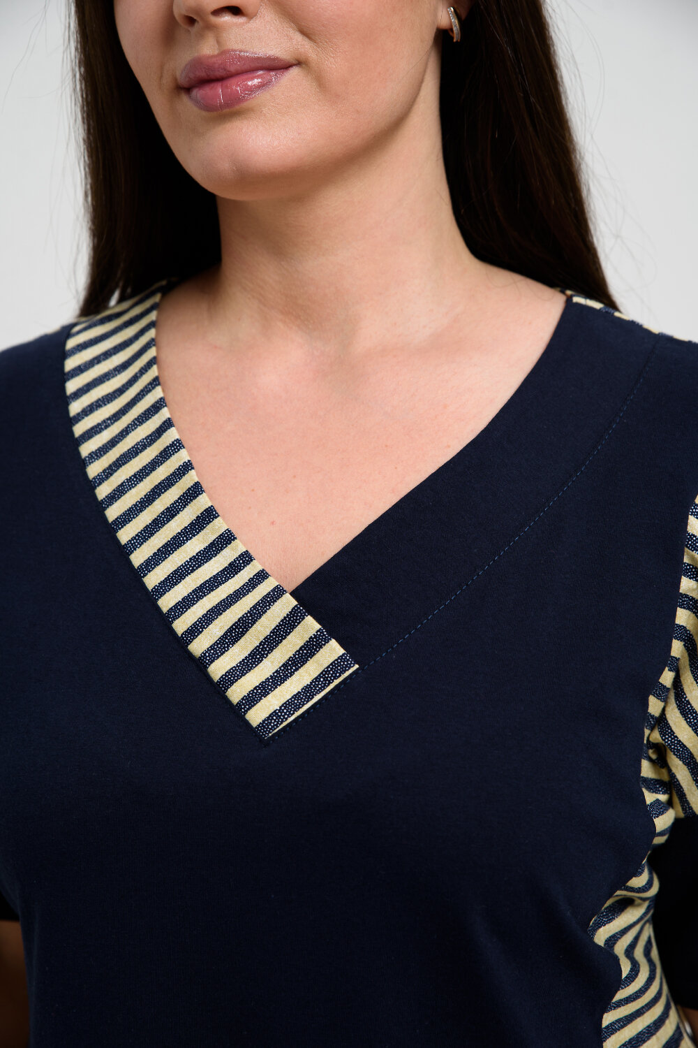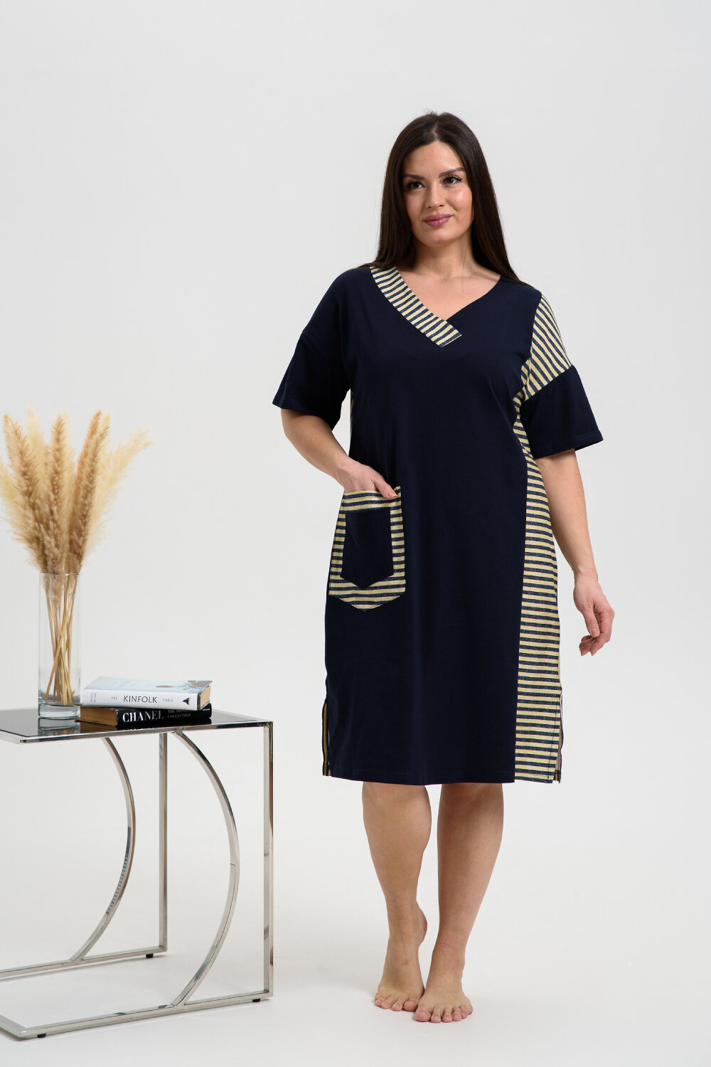 Платье прямого силуэта, с V-образной горловиной спереди, с разрезами в нижней части боковых швов. На полочке расположен фигурный двойной накладной карман. Рукав короткий. Горловина полочки обработана обтачками. Горловина спинки обработаны бейкой из основного полотна.