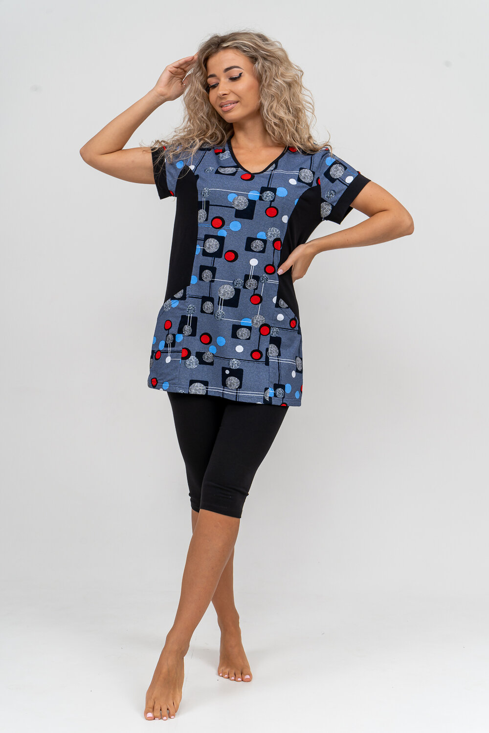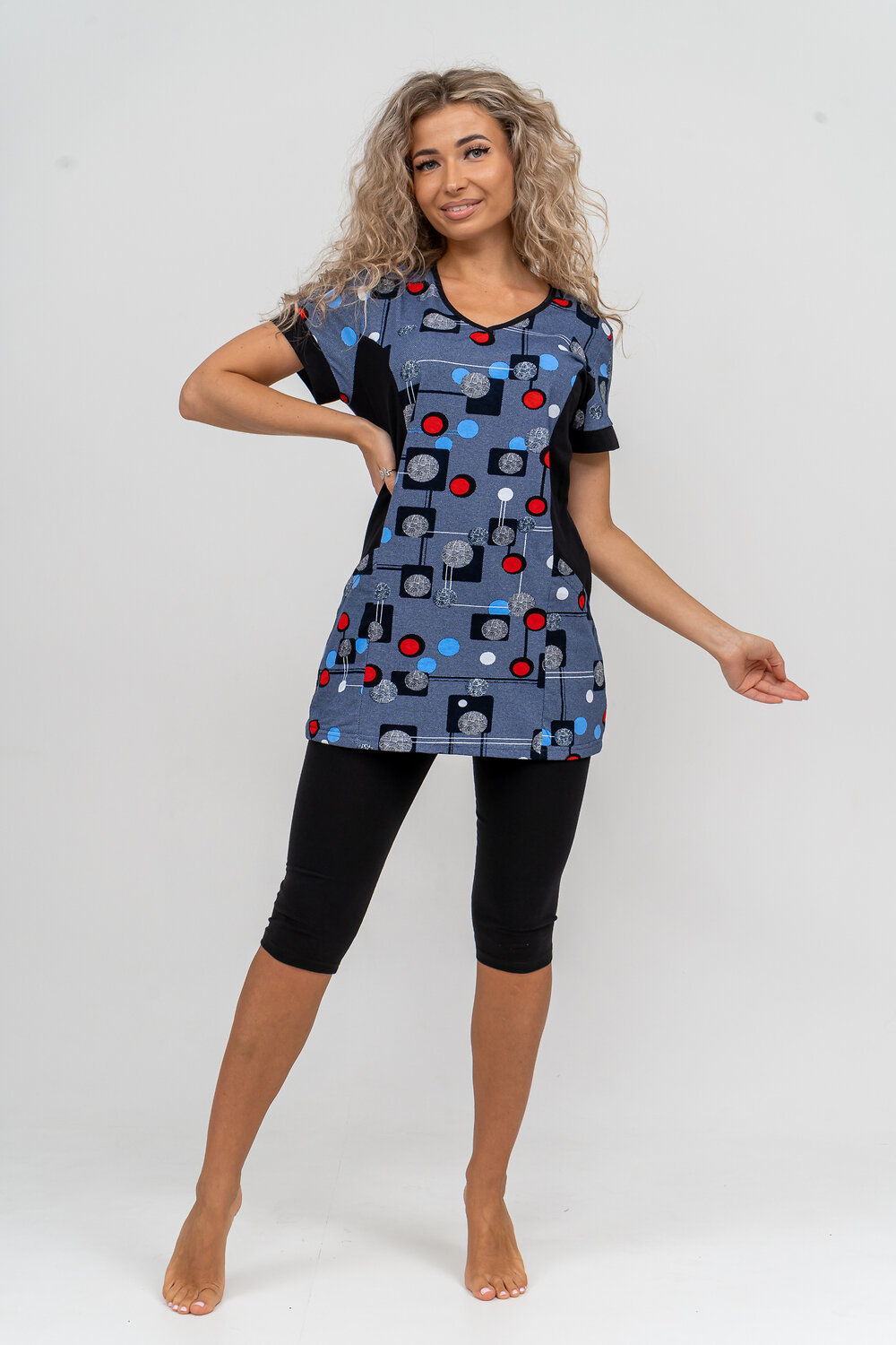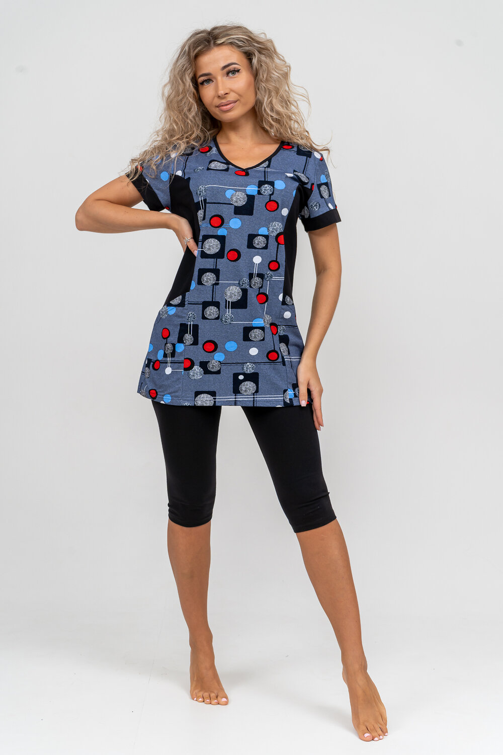 Женский костюм полуприлегающего силуэта состоит из туники и бриджей. 100% дышащий хлопок туники и эластичные бриджи несут в себе удобство при носке, гигроскопичность и износостойкость. V-образный вырез горловины придаёт изделию женственный вид. Для удобства туника имеет вместительные накладные карманы и втачные рукава с манжетами. Рельефы на полочке изделия создают идеальную посадку и безупречный внешний вид. Бриджи на резинке с высокой посадкой. В костюме такого плана Вы будете чувствовать себя комфортно как дома, так и на любимой даче. Эта двойка идеально подойдет для летнего отдыха на даче, на море или просто для девушек, которые хотят чувствовать себя уютно и комфортно дома. Летний женский костюм подходит для поездок и путешествий, загородного отдыха на природе, а также для получения лечения в больнице или санатории. Повседневное хлопковое изделие с бриджами - отличная идея для подарка любимой жене, маме, сестре или подруге на день рождения, 8 Марта или по любому другому приятному поводу. Рекомендация: для того чтобы продлить яркую жизнь Вашему костюму для дома и отдыха из хлопка, стирку производить при температуре не выше 30 градусов, а во избежание деформации изделия не прибегать к ручному отжиму (не перекручивать), утюжить слегка недосушенное изделие утюгом на паровом режиме. Покупайте наши красивые и удобные домашние костюмы с бриджами и носите с удовольствием! Приятных покупок!
