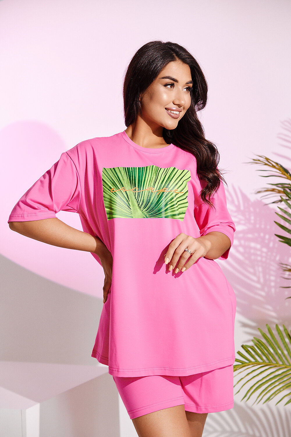 Костюм женский - свободные шорты с футболкой выполнен из кулирки с лайкрой. Спереди на футболке оригинальный принт. Горловина обработана бейкой, края подшиты, пояс на эластичной резинке. Костюм очень удобный и приятный к телу, идеально подойдет как для дома, так и для отдыха и прогулок.