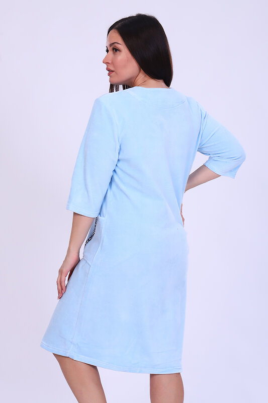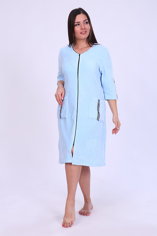 Халат женский, длиной ниже колена, свободного кроя. Рукав ниже локтя. Накладные карманы. Идеально подойдет на любую фигуру.