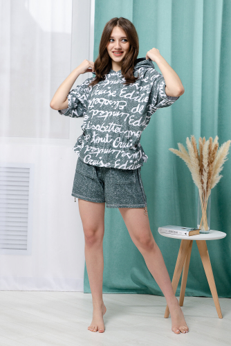 Костюм состоит из туники и шорт. Туника прямая, свободная, с резинкой по талии, с ушками на капюшоне, с разрезами в нижней части боковых швов. Рукав короткий. Шорты прямые, на поясе, с накладными карманами спереди. Вдоль боковых швов расположены молнии.