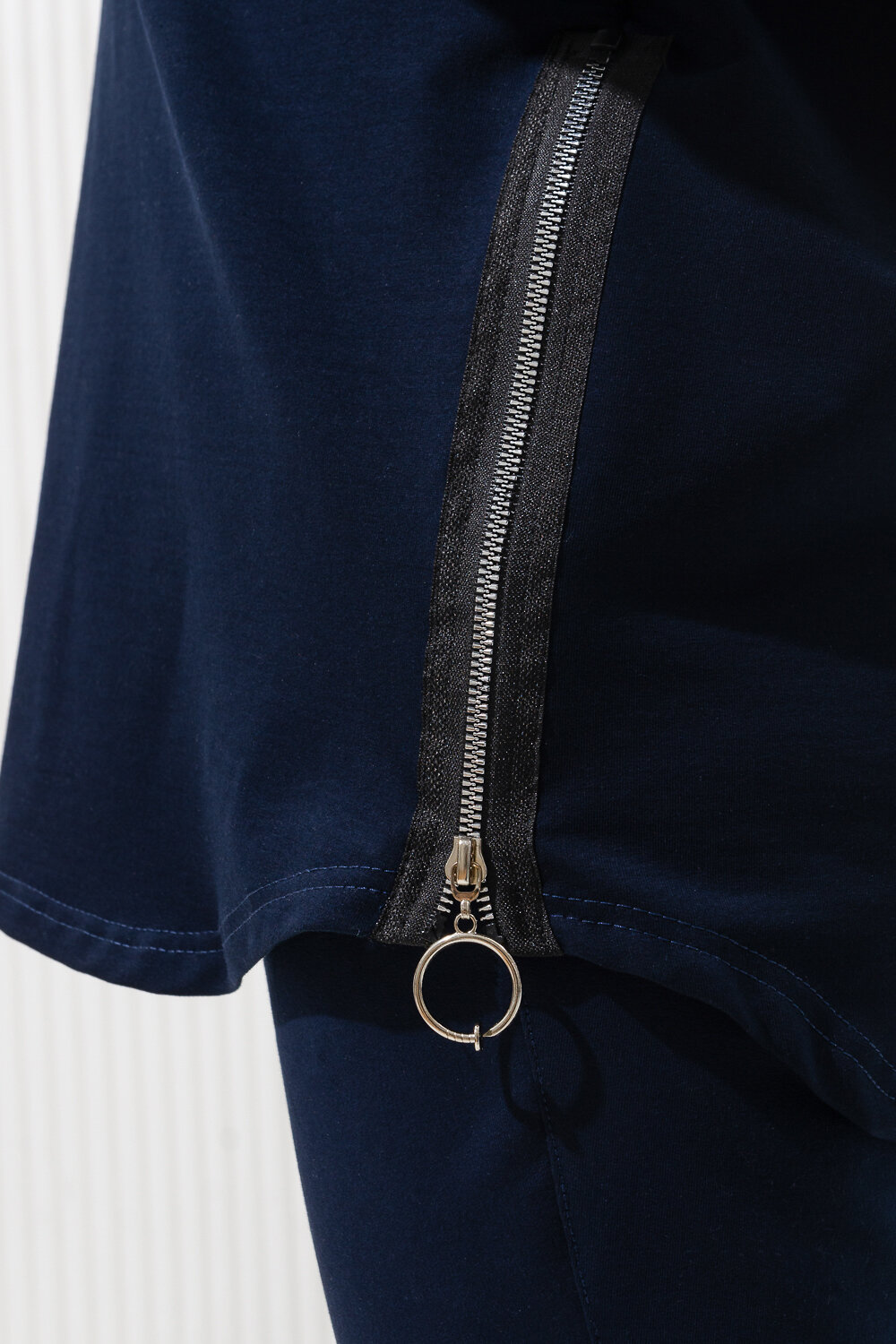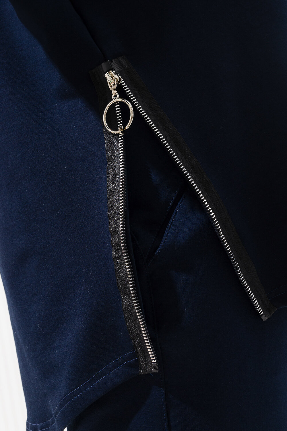 Костюм женский: толстовка и брюки. Брюки женские, свободные по бедрам, зауженные к низу. На передних частях брюк внутренние карманы. На задних частях брюк фигурные рельефы, переходящие в боковой шов. Толстовка прямого силуэта с капюшоном. Рукав спущенный. Низ толстовки фигурный, сбоку стильные молнии, при расстегивании образуют разрезы. На рукавах модный принт.