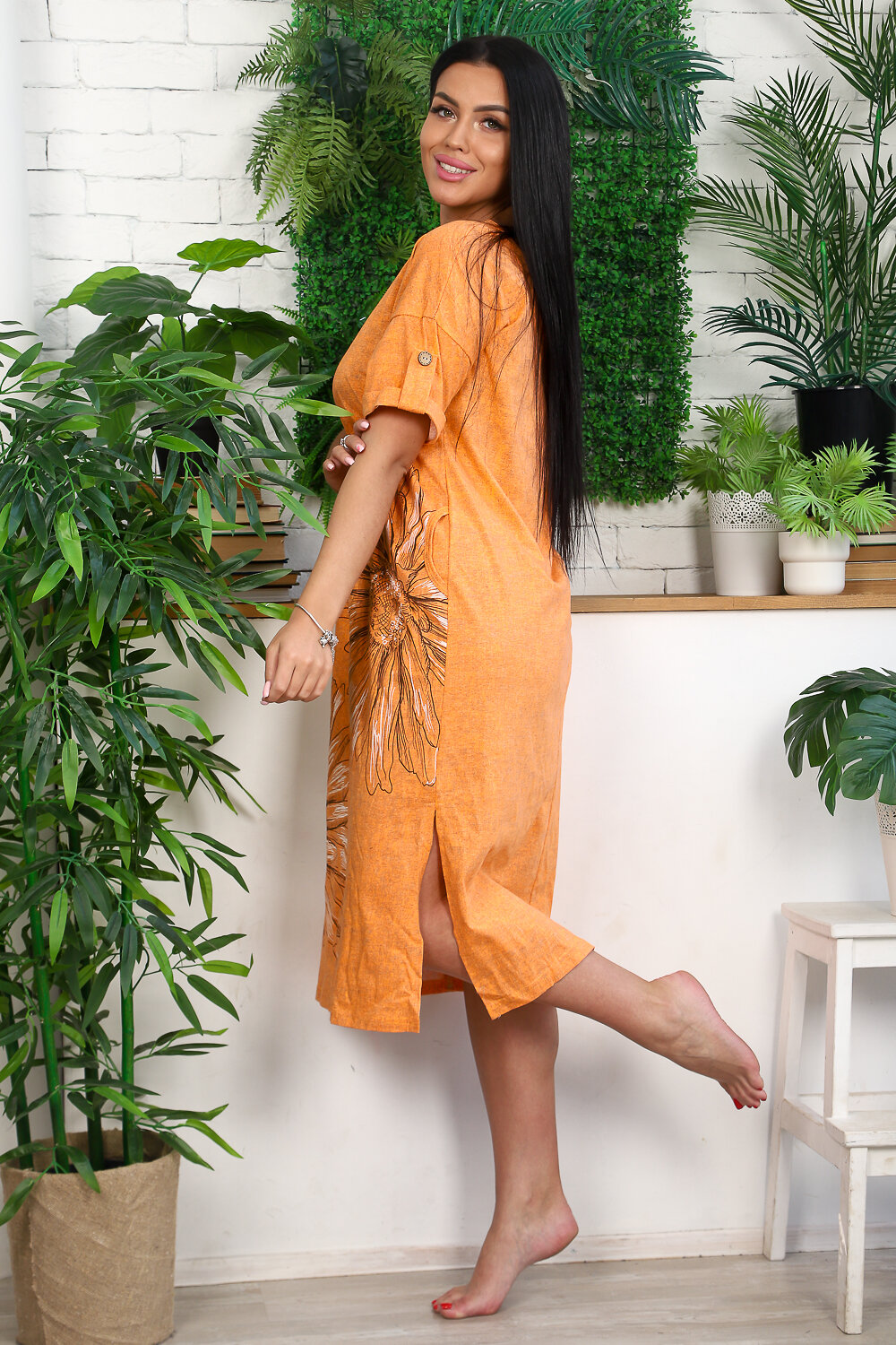 Платье прямого силуэта, с V-образной горловиной спереди и сзади, с карманами, с разрезами в нижней части боковых швов. Рукав короткий, с отложным манжетом и хлястом с пуговицей. Вход в карман обработан бейкой из основного полотна.