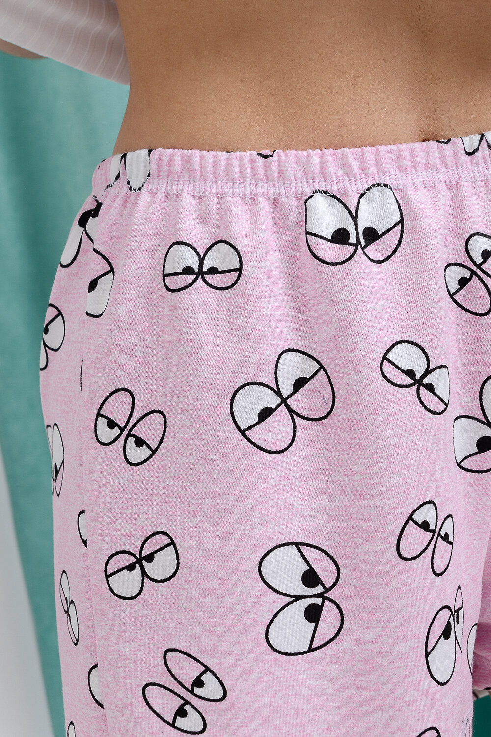 Комплект состоит из майки и шорт. Майка облегающая из лапши, с округлой горловиной. Шорты прямые, короткие, на резинке.