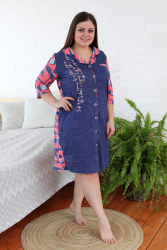 Халат на молнии, полуприлегающего силуэта, длиной ниже колена, с округлой горловиной, с карманами в боковом шве. Рукав втачной, длиной 3/4. В верхней части полочки и спинки расположены фигурные кокетки. Горловина и низ рукавов обработаны бейкой из основного полотна.
