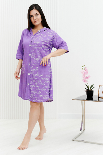 Халат женский, полуприлегающий, слегка расширенный к низу, с капюшоном. Застежка на петли-пуговицы. На полочке два накладных кармана. На спинке кокетка, и складка, которая придает изделию дополнительную свободу движения. Использование двух тканей-компаньонов придает изделию особую актуальность.