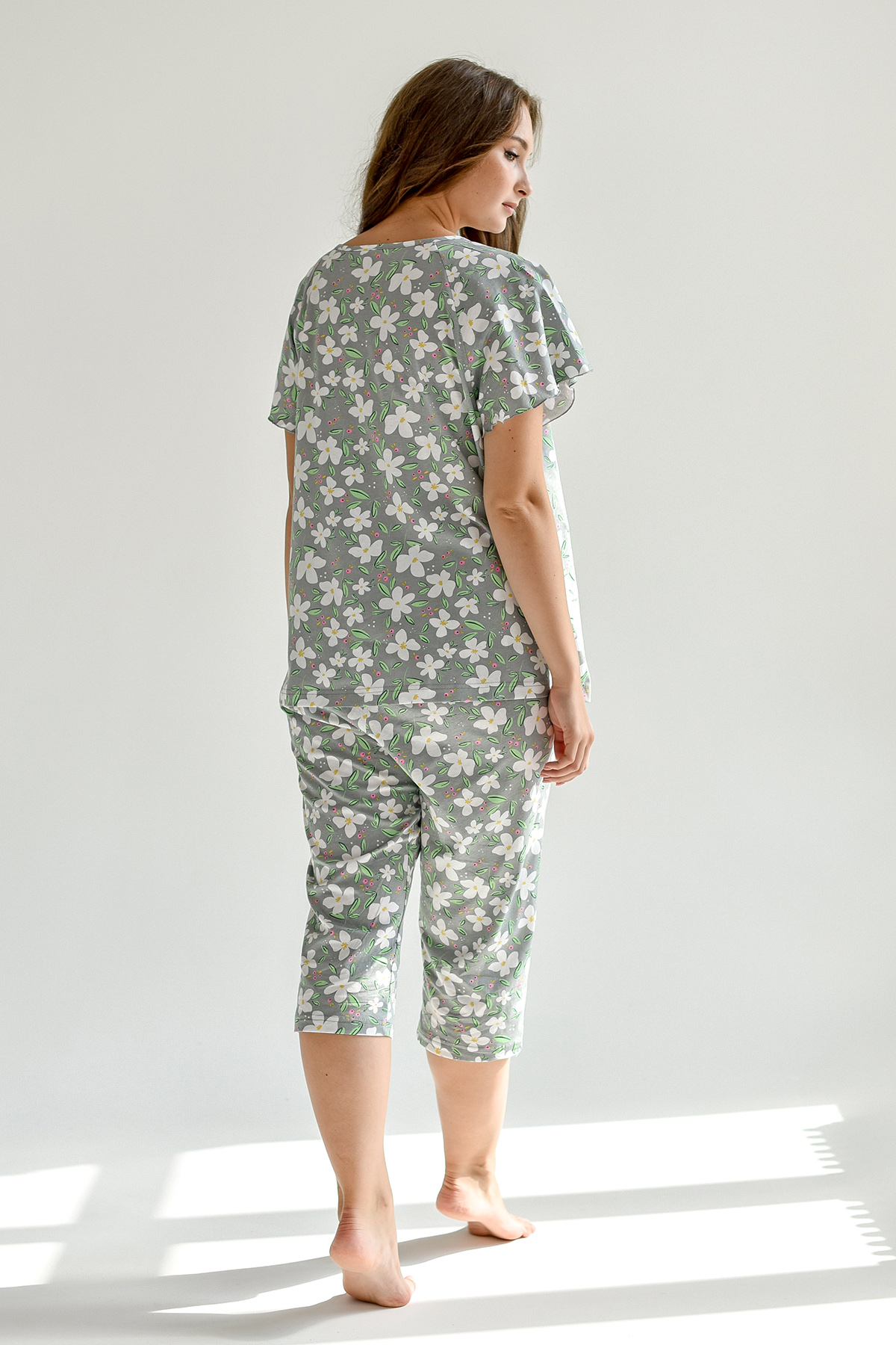Пижама женская из набивного полотна состоит из футболки и бридж. Футболка прямого силуэта с коротким рукавом-реглан. «V»-образная горловина полочки обработана обтачкой, горловина спинки окантована бейкой из основного полотна. Низ изделия обработан швом «в подгибку», низ рукавов – краеобмёточной машиной. Бриджи прилегающего силуэта с боковыми карманами в швах. Пояс цельнокроеный на резинке.