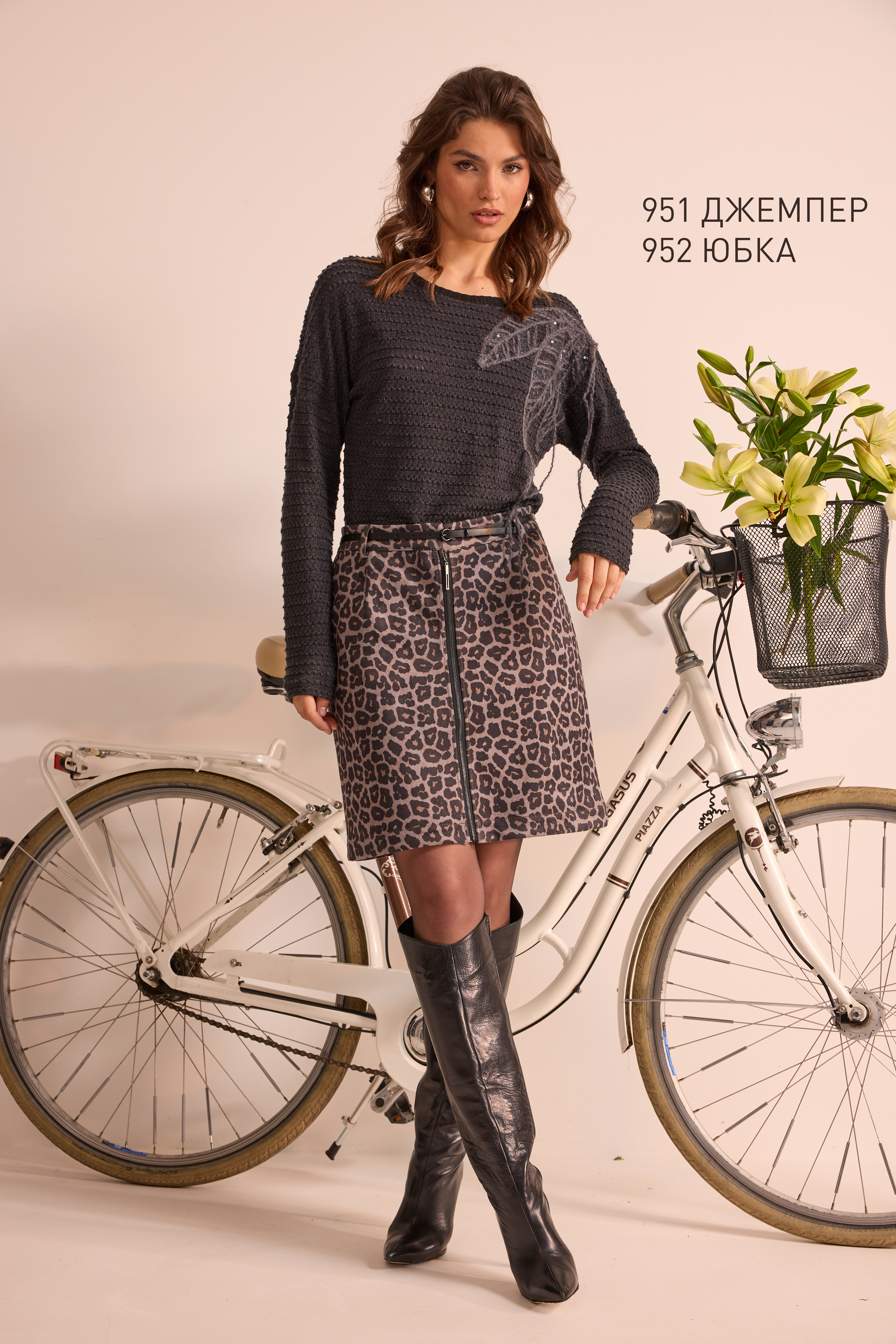 Серый леопард 42-52 3600 Стильная юбка женственной формы из замшевой ткани.. По переду и спинке юбки пояс со шлевками, где можно одеть декоративный пояс. По переднему шву функциональная молния .