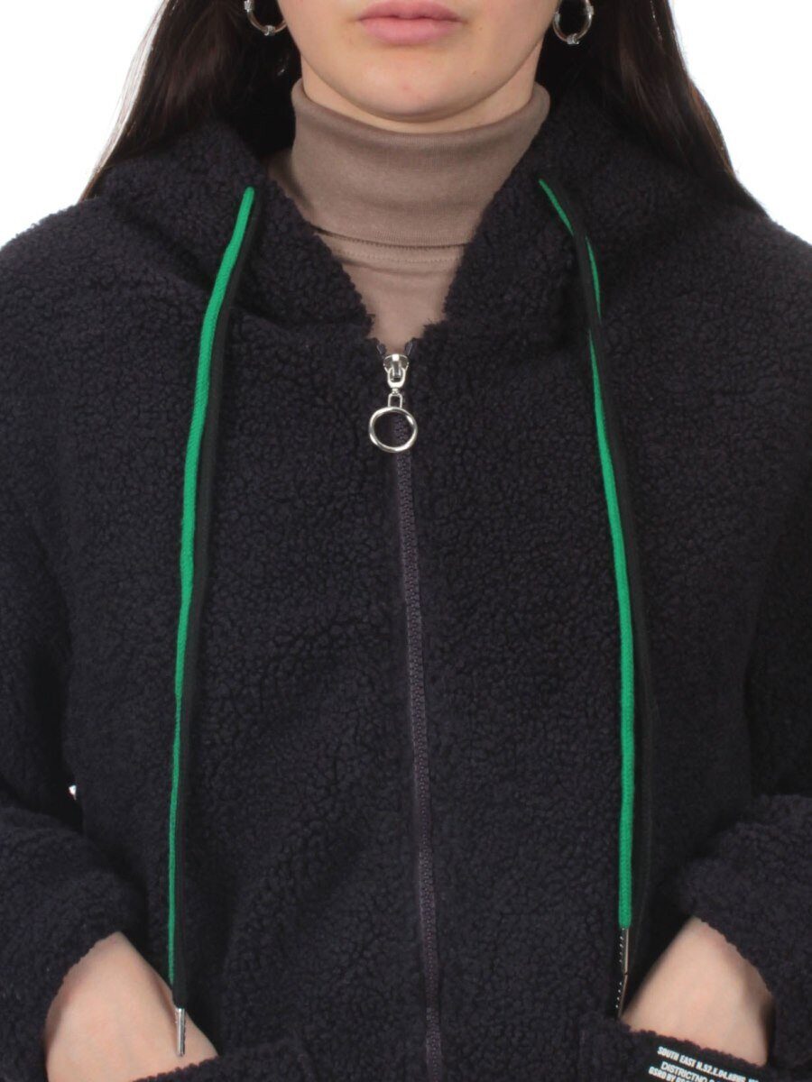 Капюшон несъемный, однослойный с регулировочным шнурком.