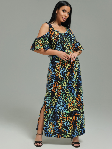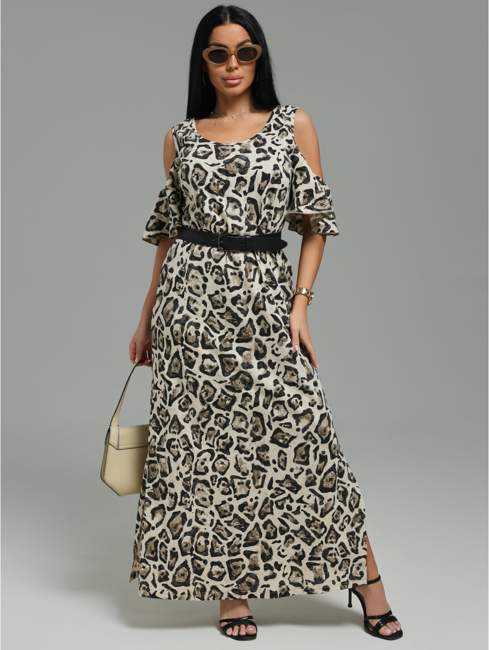 Длинное с разрезами по бокам платье в форме трапеции дополняет рукав-волан с открытым плечом.