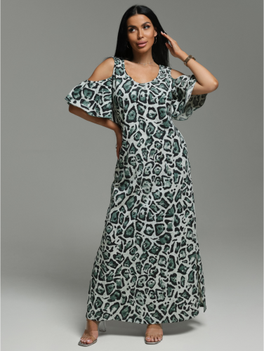 Длинное с разрезами по бокам платье в форме трапеции дополняет рукав-волан с открытым плечом.