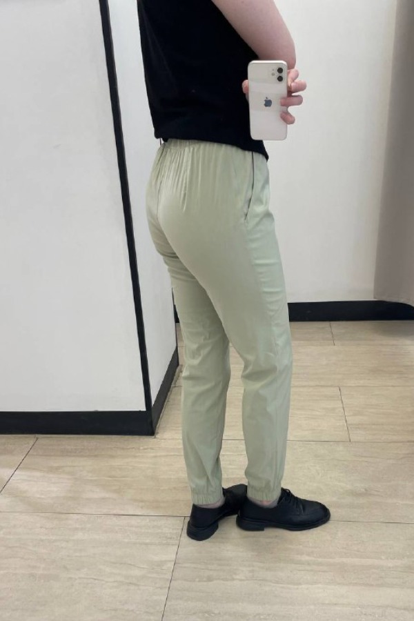 Брюки из костюмной ткани, чуть зауженные книзу. На передней части брюк имитация гульфика, декоративные подрезы и карманы. Пояс с эластичной резиной. Низ брюк на резинке.