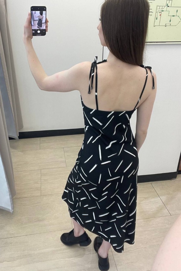 Платье на тонких завязывающихся бретелях с металлическими наконечниками из плательной ткани. Полуприлегающий силуэт, чуть расширенный книзу. Лиф двухслойный с красивым вырезом «качели».