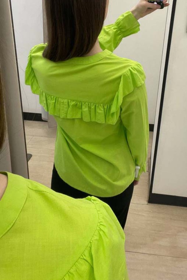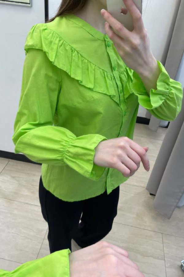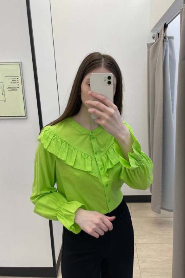 Блуза полуприлегающего силуэта с притачной планкой и застёжкой на пуговицы. Изделие из хлопковой ткани. На передней и задней части изделия выполнена кокетка с рюшей. Линия горловины оформлена плоским воротником в виде обтачки. Втачной рукав в романтическом стиле, присборен на резинку.