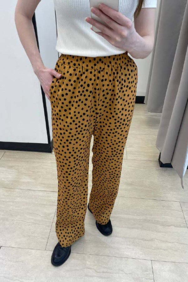 Летний костюм из вискозной ткани компаньонов. Рубашка свободного силуэта с разрезами в боковых швах и застёжкой на пуговицы. Рубашечный длинный рукав. Вырез горловины обработан отложным воротником на стойке. На задней части изделия выполнена кокетка с небольшой складкой. Брюки прямого силуэта. Пояс притачной с эластичной резиной, в боковых швах карманы. Легкий, свободный, очень удобный и комфортный к телу костюм.
