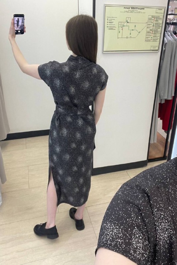 Платье из вискозной ткани. Свободный силуэт с разрезом в боковом шве. По центру передней и задней части изделия выполнен шов. Цельнокроеная стойка, переходящая в V-образный вырез горловины, визуально делает фигуру стройнее. Цельнокроеный короткий рукав. В комплекте пояс из основной ткани.