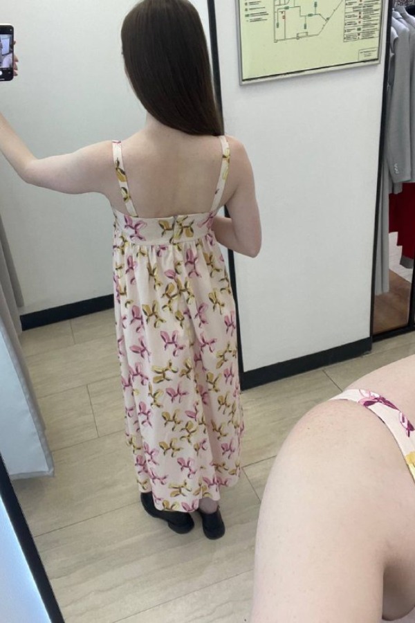 Платье на бретелях из вискозной плательной ткани. Изделие, прилегающее в области груди и свободное в области бедер. Лиф двухслойный с красивым женственным вырезом. Верхняя часть переда отрезная под линией груди, с фигурными подрезами. На спинке застежка-молния. В таблице размеров представлены параметры человека, а не изделия.