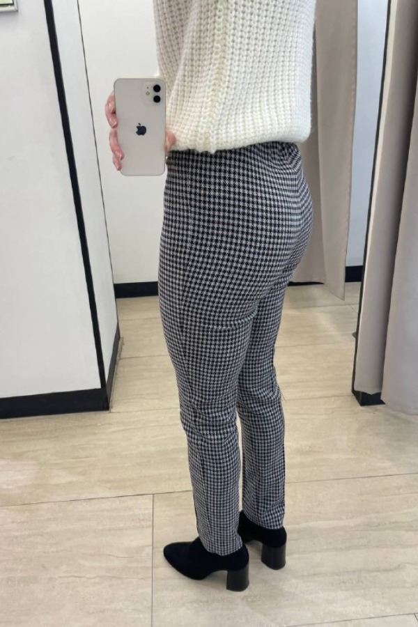 Брюки прямого силуэта, зауженные книзу из костюмной ткани. На передней части брюк застрочены стрелки. Пояс притачной с эластичной резиной.