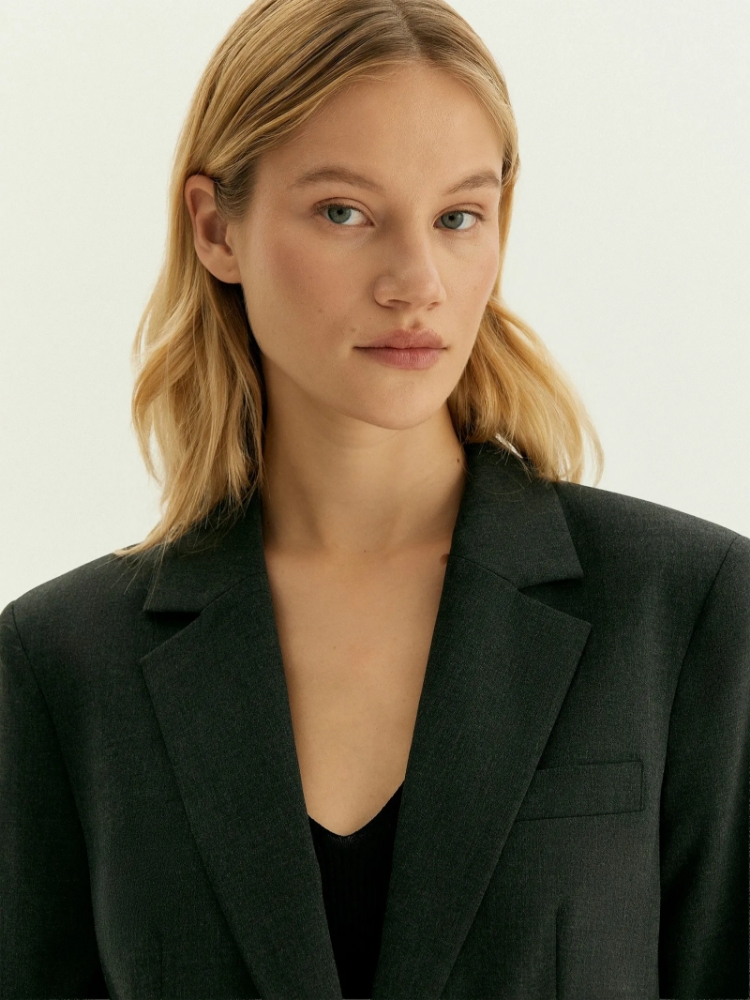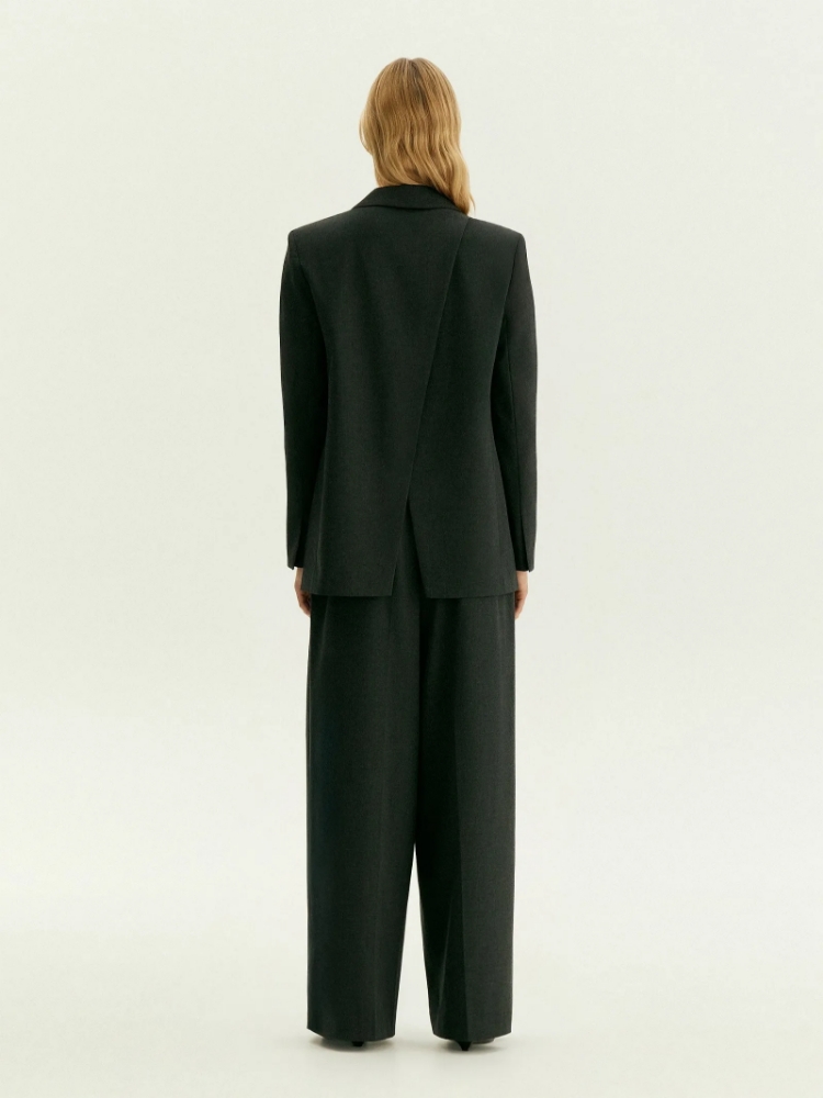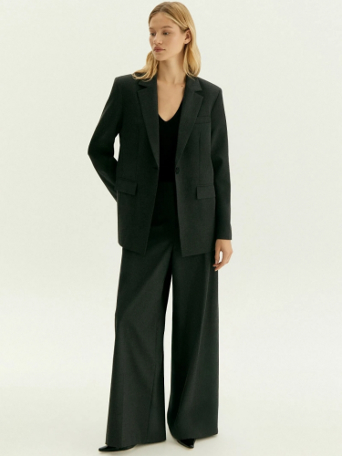 Модный жакет в тёмно-сером цвете для деловых и торжественных образов. На спинке выполнена элегантная шлица-"ласточка", которая стала главной изюминкой вещи. Удлинённая модель прямого кроя на одной пуговице, с глубоким треугольным вырезом смотрится актуально. Острые и длинные лацканы, широкие прямоугольные клапаны на карманах придают образу собранности. Жакет можно носить с брюками из комплекта и любым другим базовым низом. Изделие выполнено из материала с содержанием вискозы