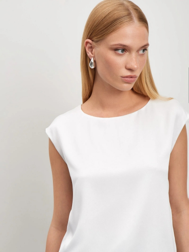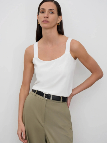 Базовый молочный топ без рукавов. Выполнен из мягкой и приятной к телу ткани с содержанием вискозы. Прямой силуэт подойдёт любому типу фигуры. Овальный вырез изделия открывает вид на ключицы и шею. Топ станет лаконичным дополнением к деловым и ежедневным образам