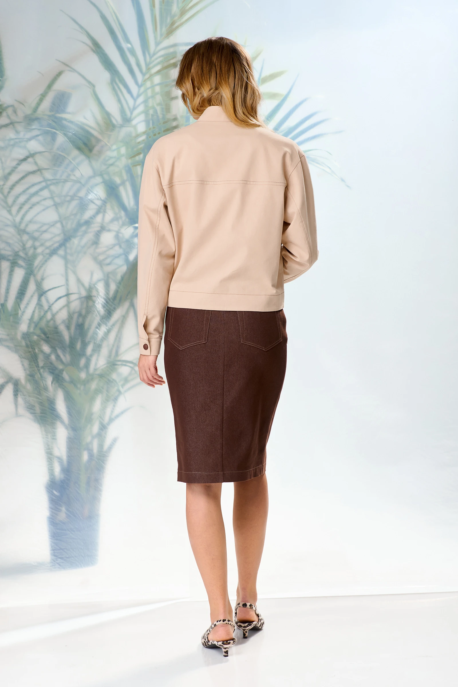 описание: Комплект женский (жакет и юбка). Жакет женский, свободного силуэта, длиной до линии бедер, с втачными рукавами, с втачной стойкой по горловине, с центральной сквозной застежкой на 6 кнопок. Детали переда жакета с нагрудными и талиевыми вытачками, с накладными карманами и клапанами. Деталь спинки жакета с кокеткой. Рукава втачные двухшовные, с локтевыми и передними швами, с притачными манжетами, с застежкой на 1 кнопку. Внизу локтевых швов обработан разрез. Вырез горловины «под горло», с втачной стойкой.Юбка прямая к низу, длиной до середины коленей, с притачным поясом. Застежка на тесьму-молнию и 1 кнопку. Переднее полотнище юбки со средним швом, который заканчивается разрезом, в боковых швах обработаны карманы фигурной формы. Заднее полотнище юбки со средним швом, с накладными карманами и вытачками на каждой половинке.