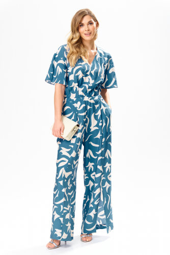 описание: Комбинезон женский, свободного силуэта, со спущенной линией плеча, с втачным поясом на уровне линии талии, в который вставлена эластичная тесьма.Лиф детали переда комбинезона со средним швом, на уровне талии обработаны 2 складки. Нижние части с рельефными швами, которые заканчиваются разрезами, в боковых швах обработаны наклонные карманы. Лиф детали спинки комбинезона с запахом, вверху которого обработан разрез с застежкой на 1 навесную петлю и пуговицу, по середине застежка на 1 потайную кнопку. На нижней части по шву притачивания пояса обработаны по одной вытачке на каждой половинке. Рукава втачные двухшовные, короткие, с разрезами. Вырез горловины комбинезона «V-образной» формы, обработан обтачкой.Декор может отличаться от представленного на фотографии.