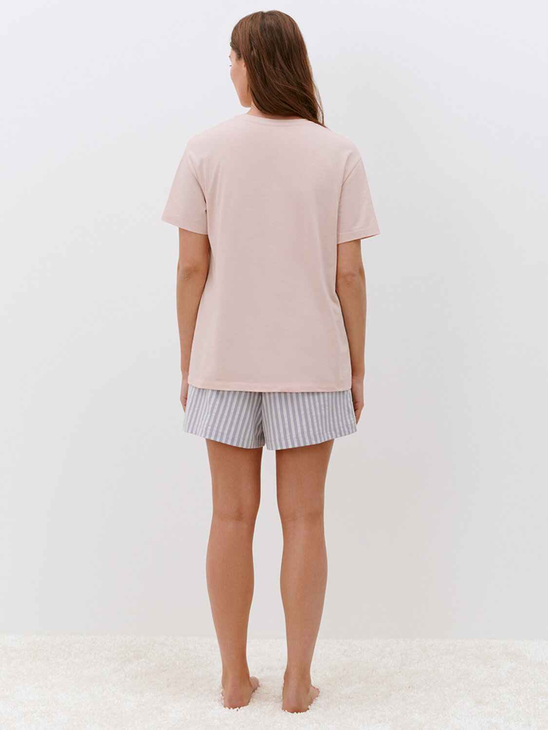 "Женская пижама: прямая футболка с круглым вырезом и коротким рукавом и свободные шорты с карманами и поясом на резинке.