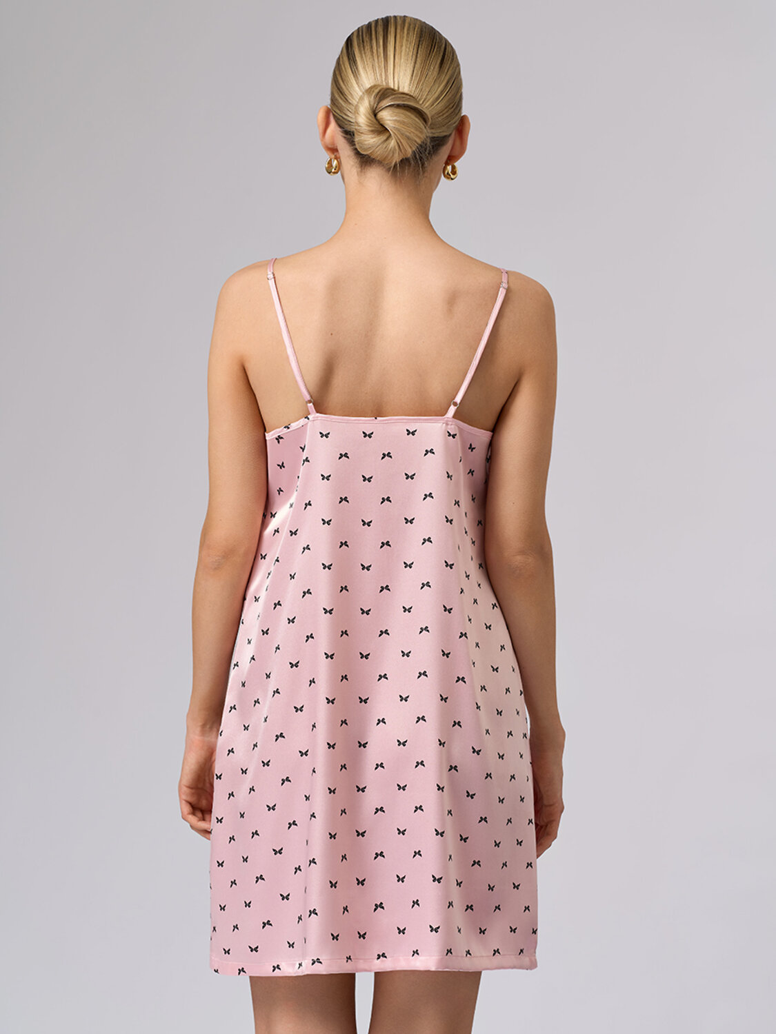 Женская короткая сорочка с V-образным вырезом с контрастным кантом на тонких регулируемых бретелях.