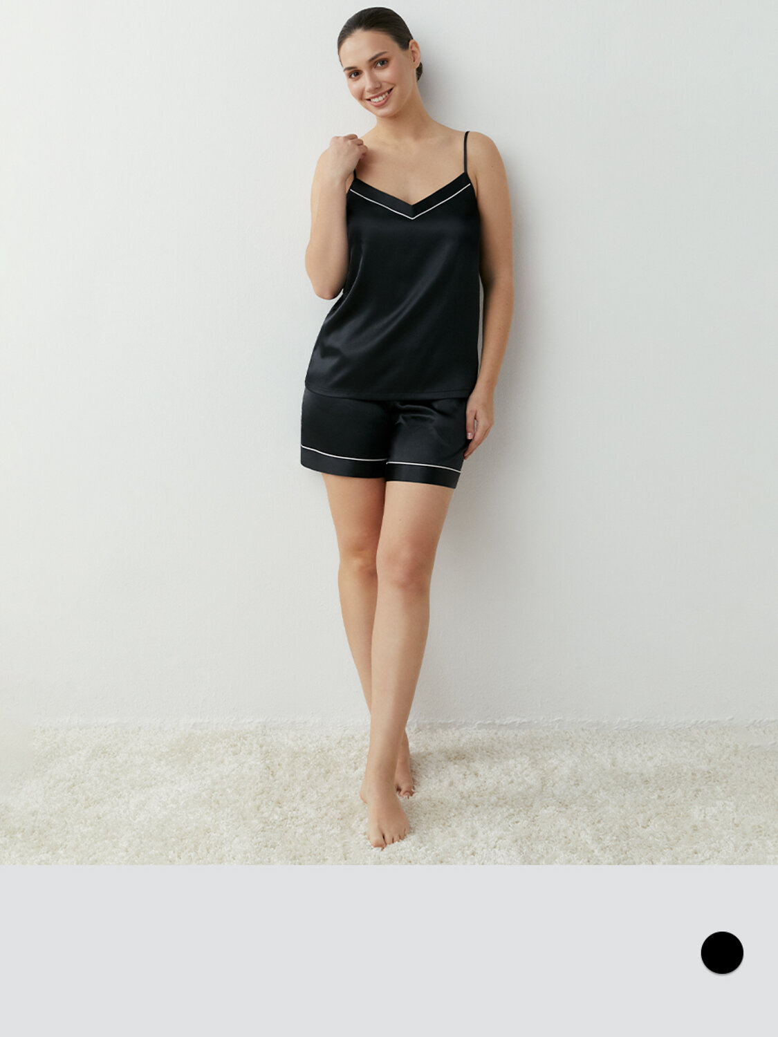 Женская однотонная пижама: прямой топ с V-образным вырезом с контрастным кантом на тонких регулируемых бретелях и свободные шорты средней длины с резинкой на поясе и карманами.Низ шорт обработан манжетой с контрастным кантом.
