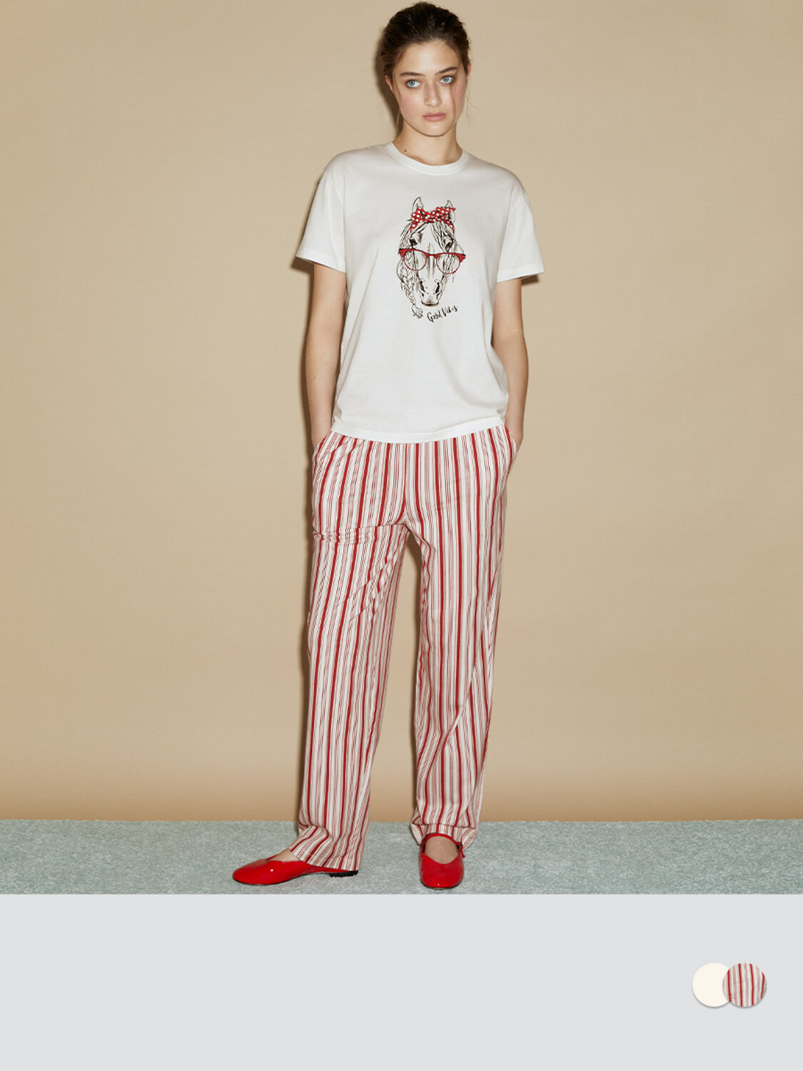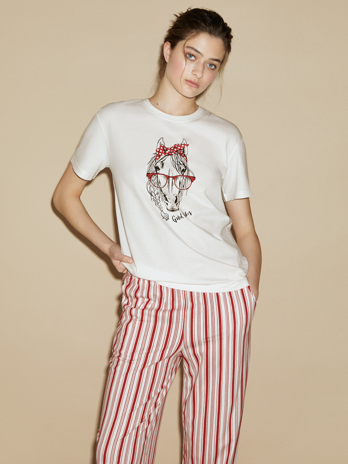 Женская пижама с трендовым принтом: классическая футболка с коротким рукавом и круглым вырезом, а также прямые брюки с карманами и поясом на резинке.