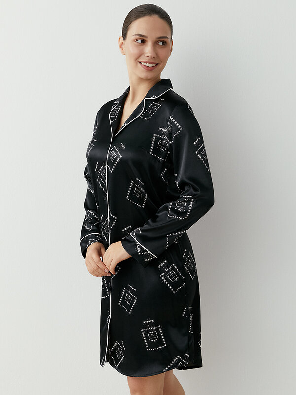 Женская пижамная рубашка на пуговицах с контрастным принтом и длинным рукавом, длиной до колена. Рубашка прямого силуэта с нагрудными вытачками.