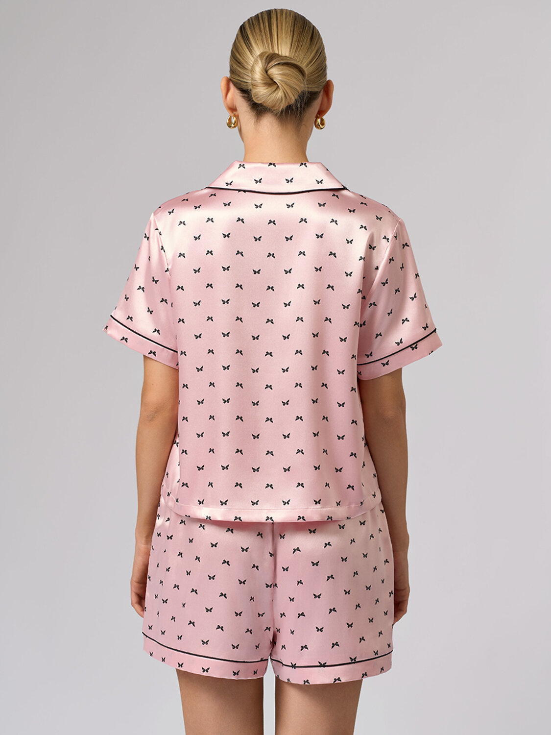 Женская пижама с изящным принтом: прямая рубашка на пуговицах с коротким рукавом с контрастным кантом и свободные шорты средней длины с карманами и поясом на резинке.