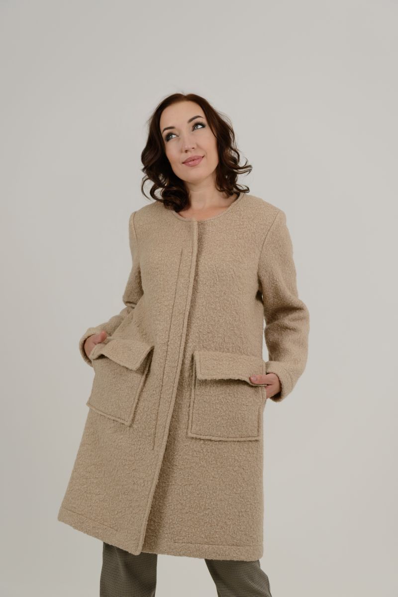 Описание: Пальто без подкладки, с карманами, застежка на молнии и одну кнопку вверху, вареная шерсть.