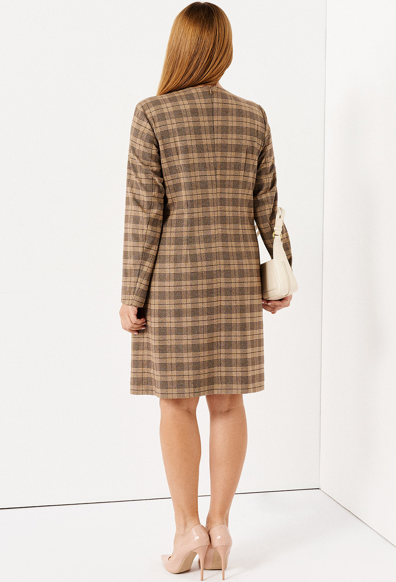 Короткое платье в строгом стиле. Прямой крой отлично садится по фигуре и зрительно стройнит ее.