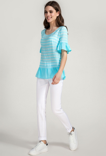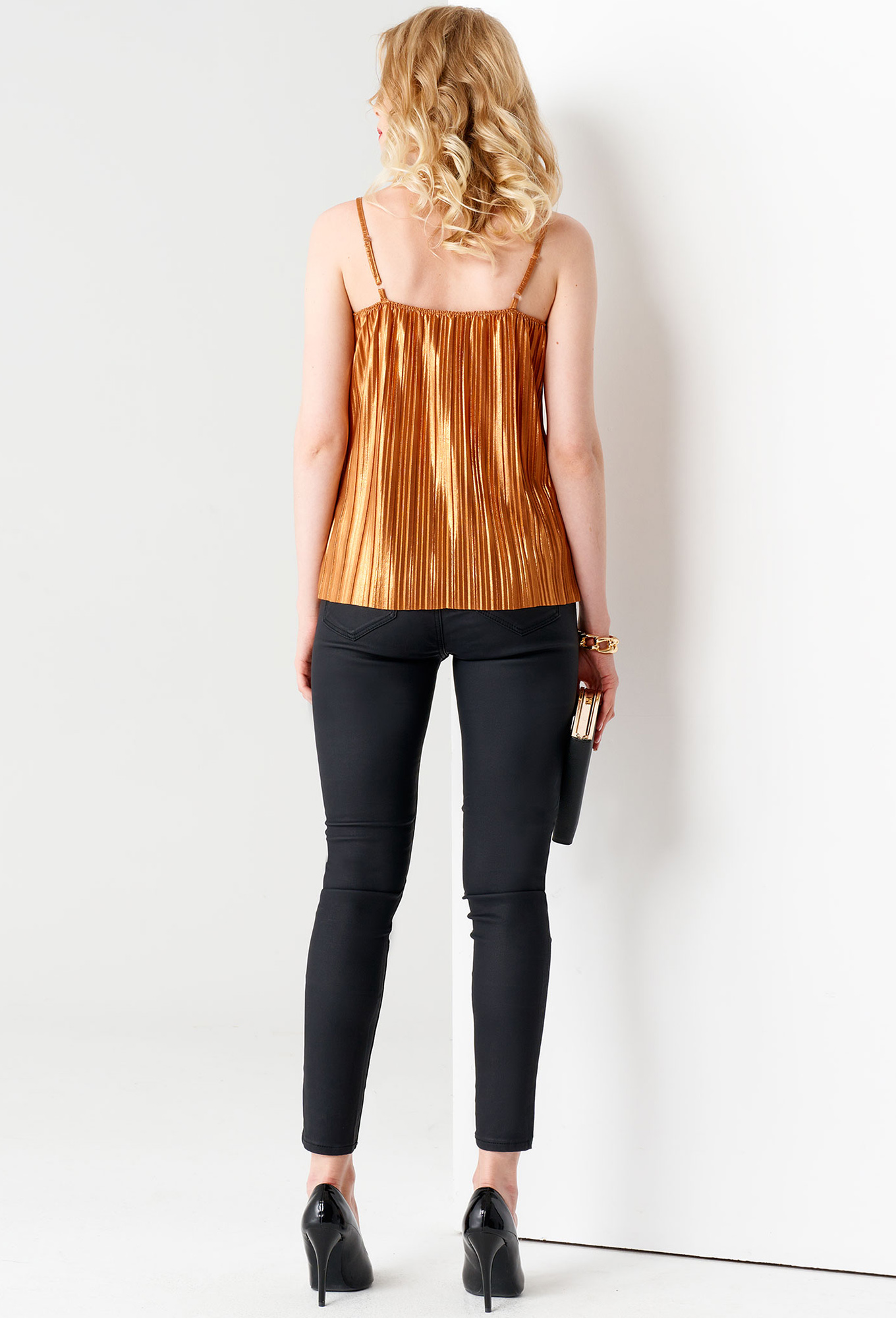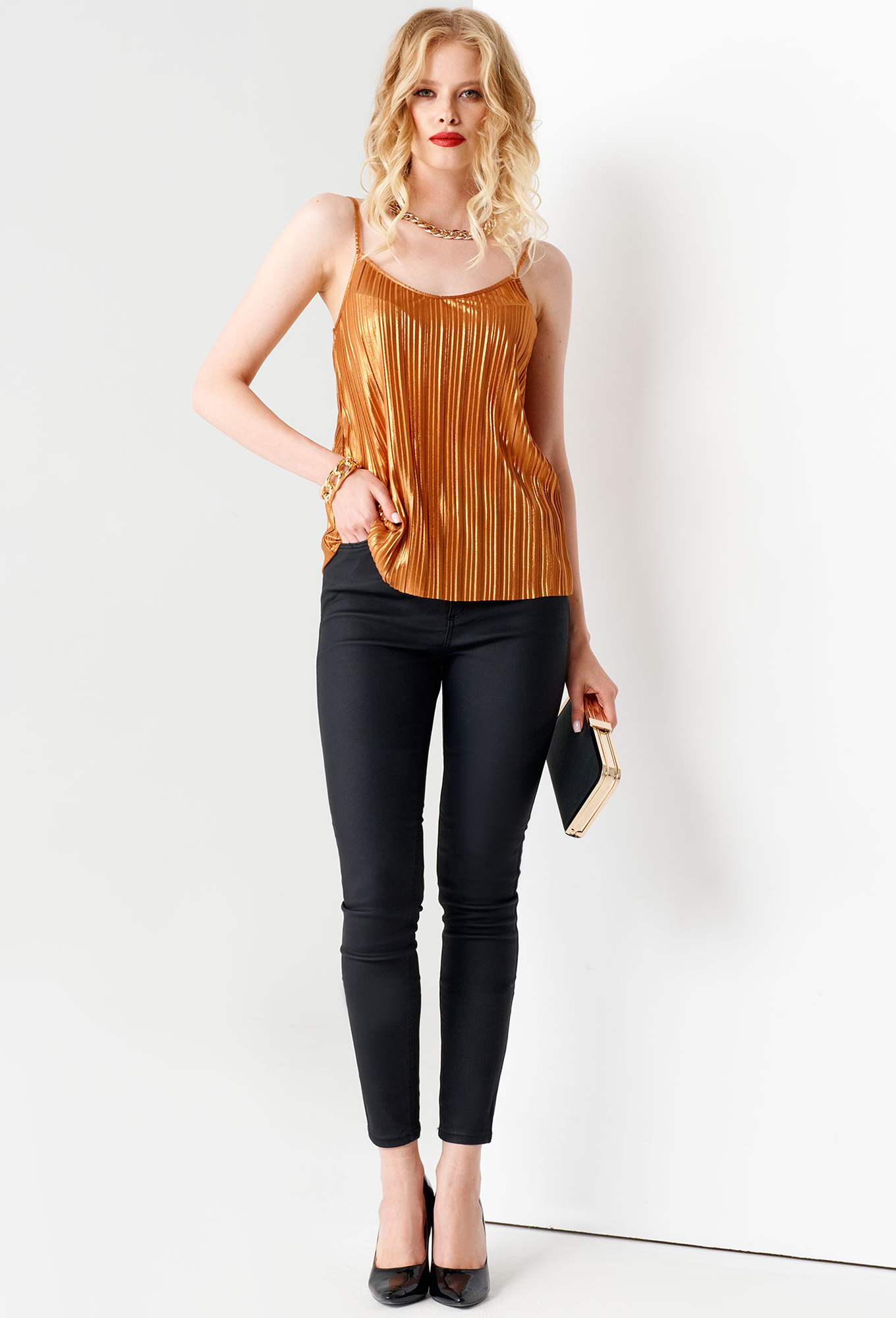 Блуза на бретельках из тонкой струящейся ткани с золотистым напылением. Изделие в мелкую складочку красиво переливается и блестит в лучах естественного и искусственного освещения. Женская майка свободного кроя идеально садится по фигуре. Блуза дополнена резинкой по спинке для комфортной носки. Длину тонких бретелек вы сможете регулировать под себя. Плиссированная летняя блуза сшита из нежного, приятного на ощупь трикотажа. Износоустойчивый материал максимально пропускает воздух, не деформируется, не электризуется.