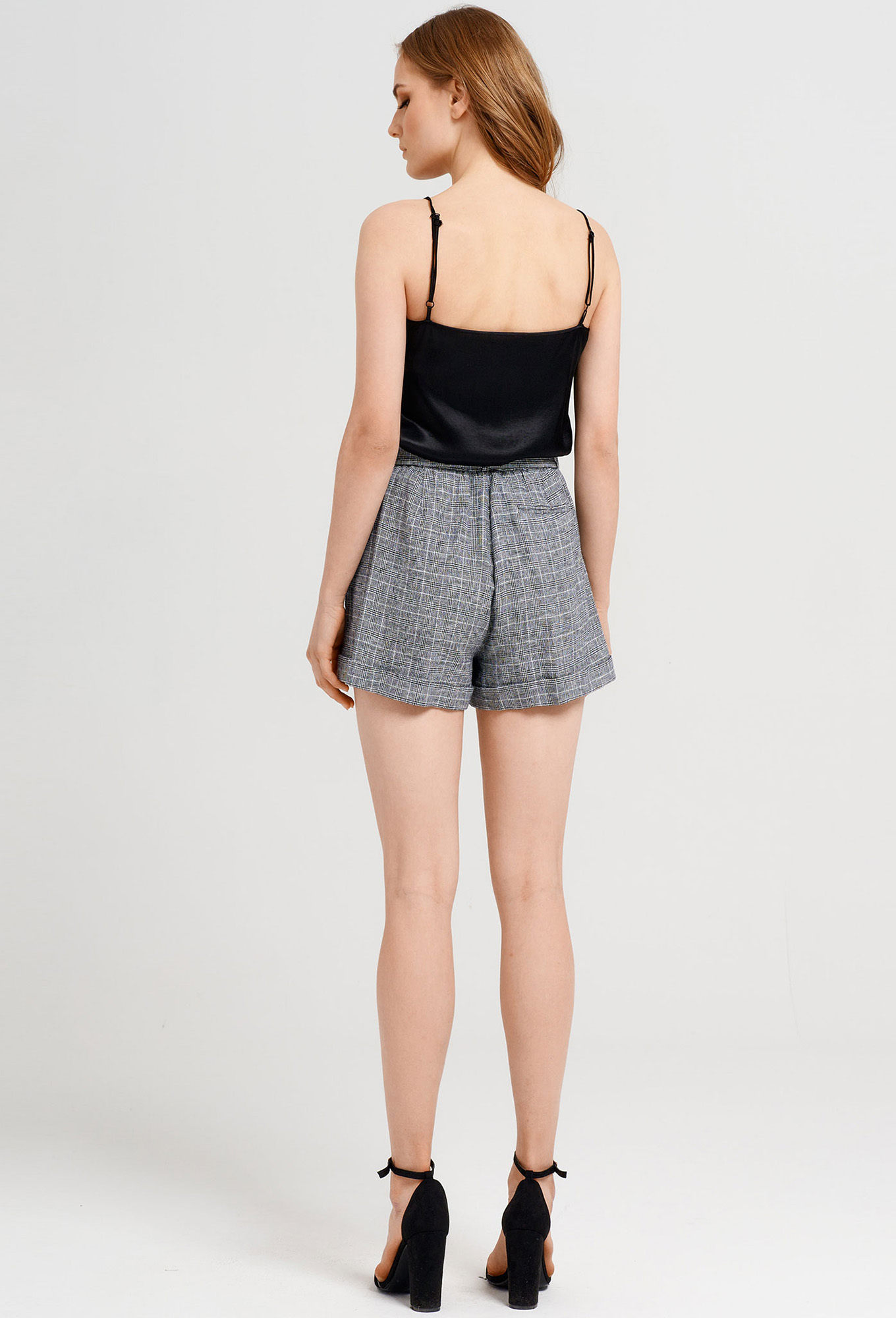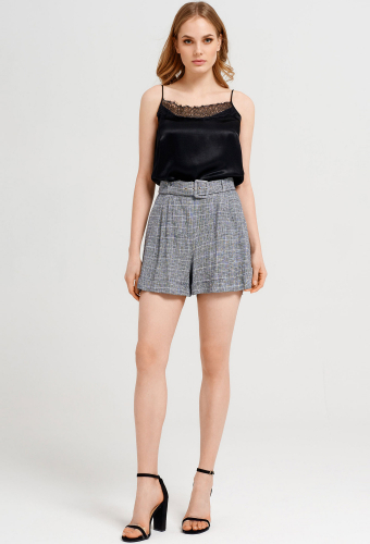 Стильные и удобные шорты с рисунком в клетку. Шорты на отрезном поясе на талии, с ремнём из основной ткани, застёгивающимся на пряжку с язычком и блочками. По спинке в поясе оформлена резинка. Застёжка спереди на молнию с гульфиком и петлю-пуговицу на поясе. По бокам выполнены карманы.Также спереди выполнены защипы от верхнего среза. По низу шорт имитация отложных манжет.