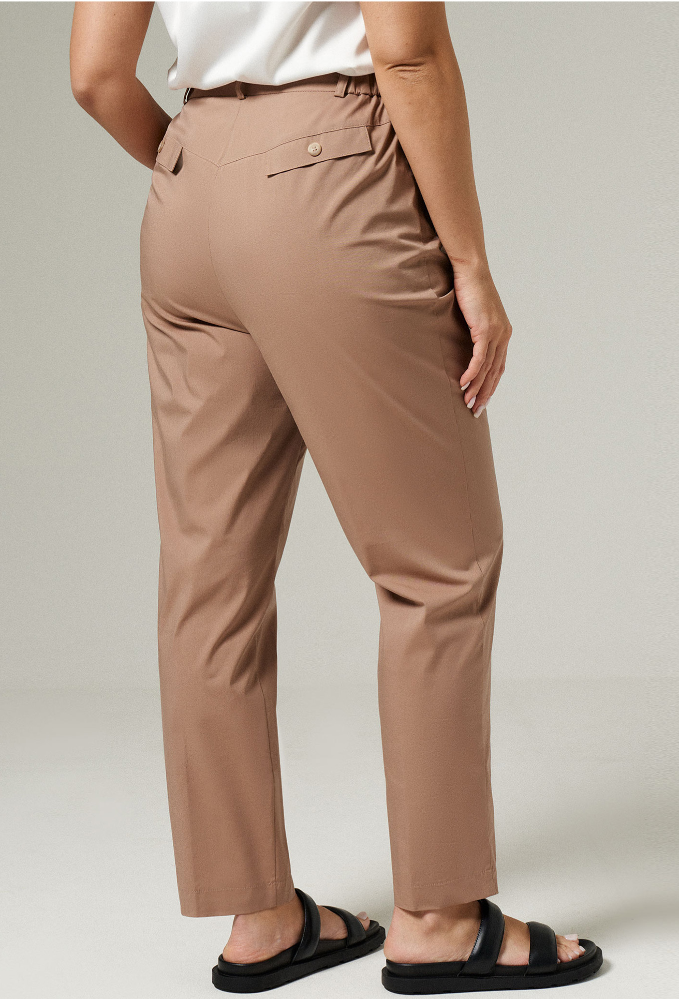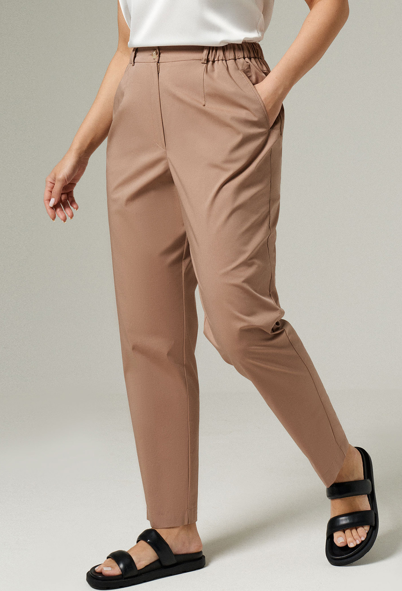 Брюки с высокой талией, модель слегка заужена к низу. Для комфортной носки пояс изделия дополнен встроченой резинкой и шлевками под ремень. Застежки – пуговица-петля и змейка в гульфике. Карманы прорезные.