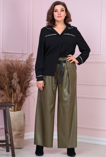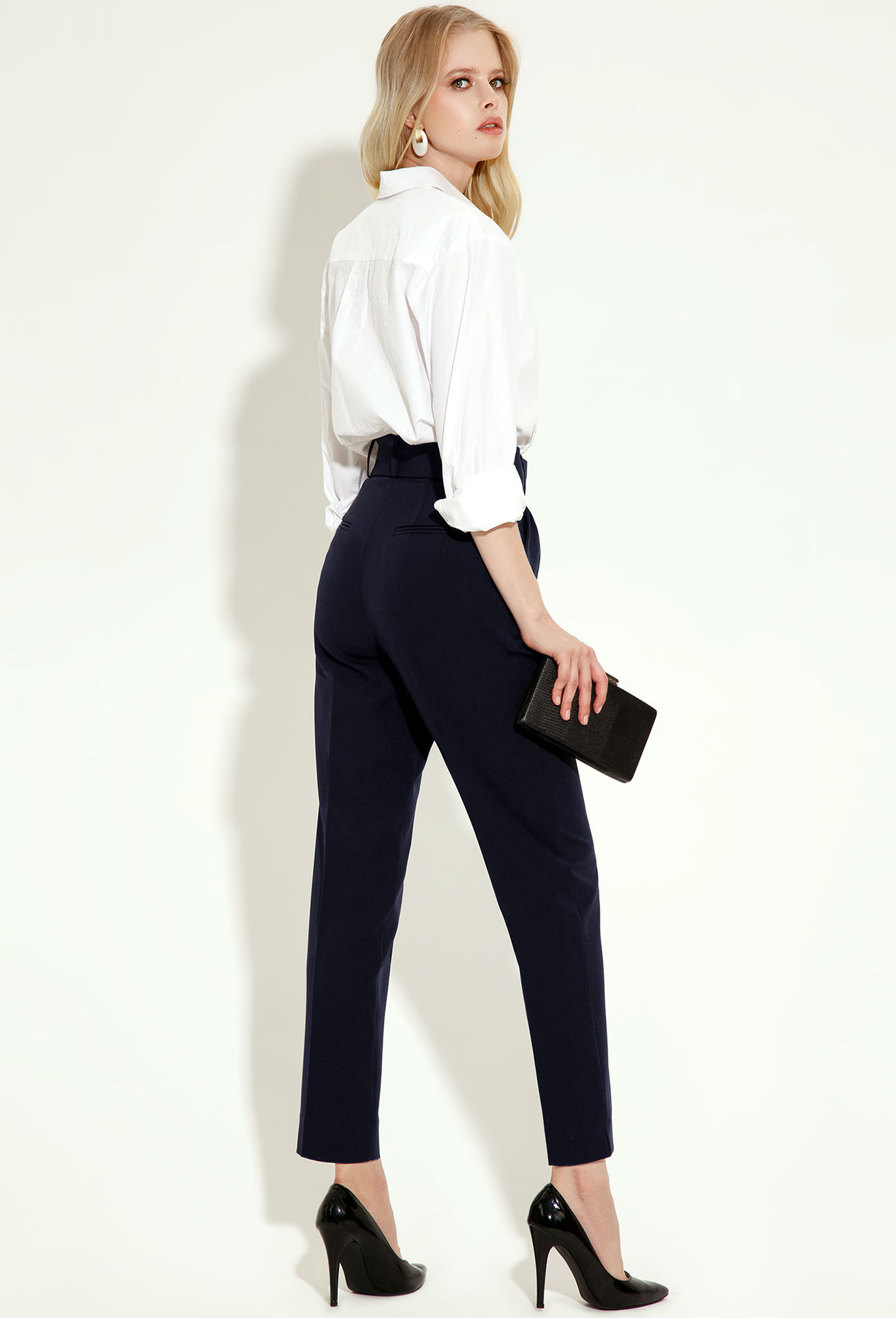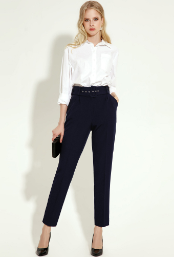 Стильные молодежные брюки с высокой посадкой на талии. Брюки заужены к низу, по низу по бокам разрезы. По переду от пояса имеются складочки. По бокам карманы. Брюки дополнены широким поясом с обтяжной пряжкой из основной ткани.