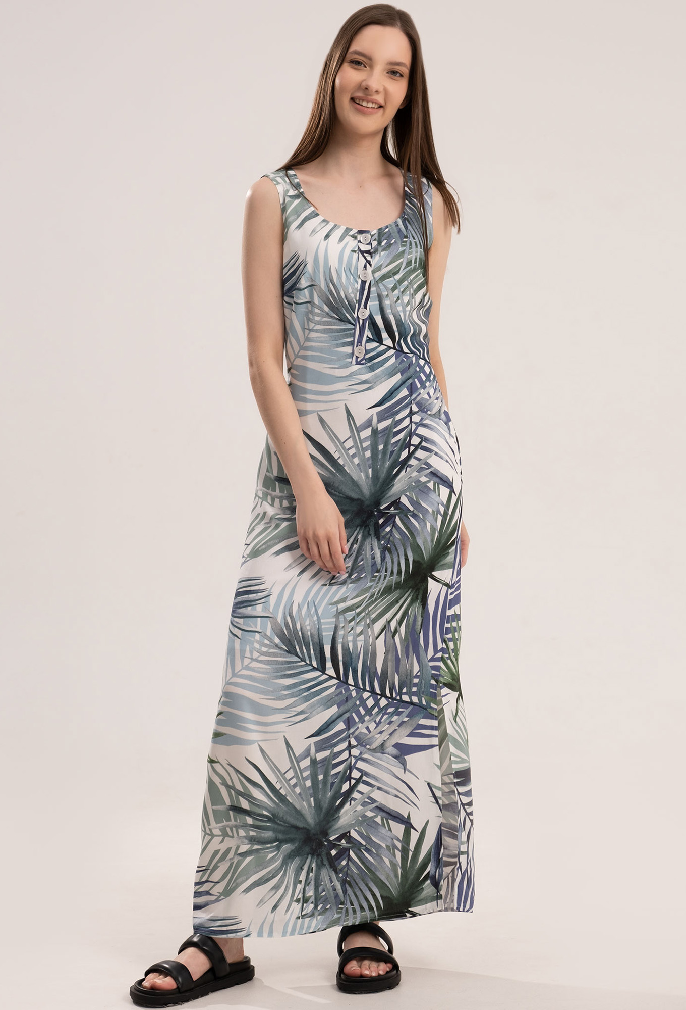 Платье-сарафан прямого кроя. Длинное платье без рукавов дополнено разрезом по ноге в боковом шве. Не широкие бретели маечного типа отлично подчеркивают линию декольте. Платье из вискозы очень легкое и удобное. Сзади платье на бретелях фиксируется поясом, прорисовывая линию талии.