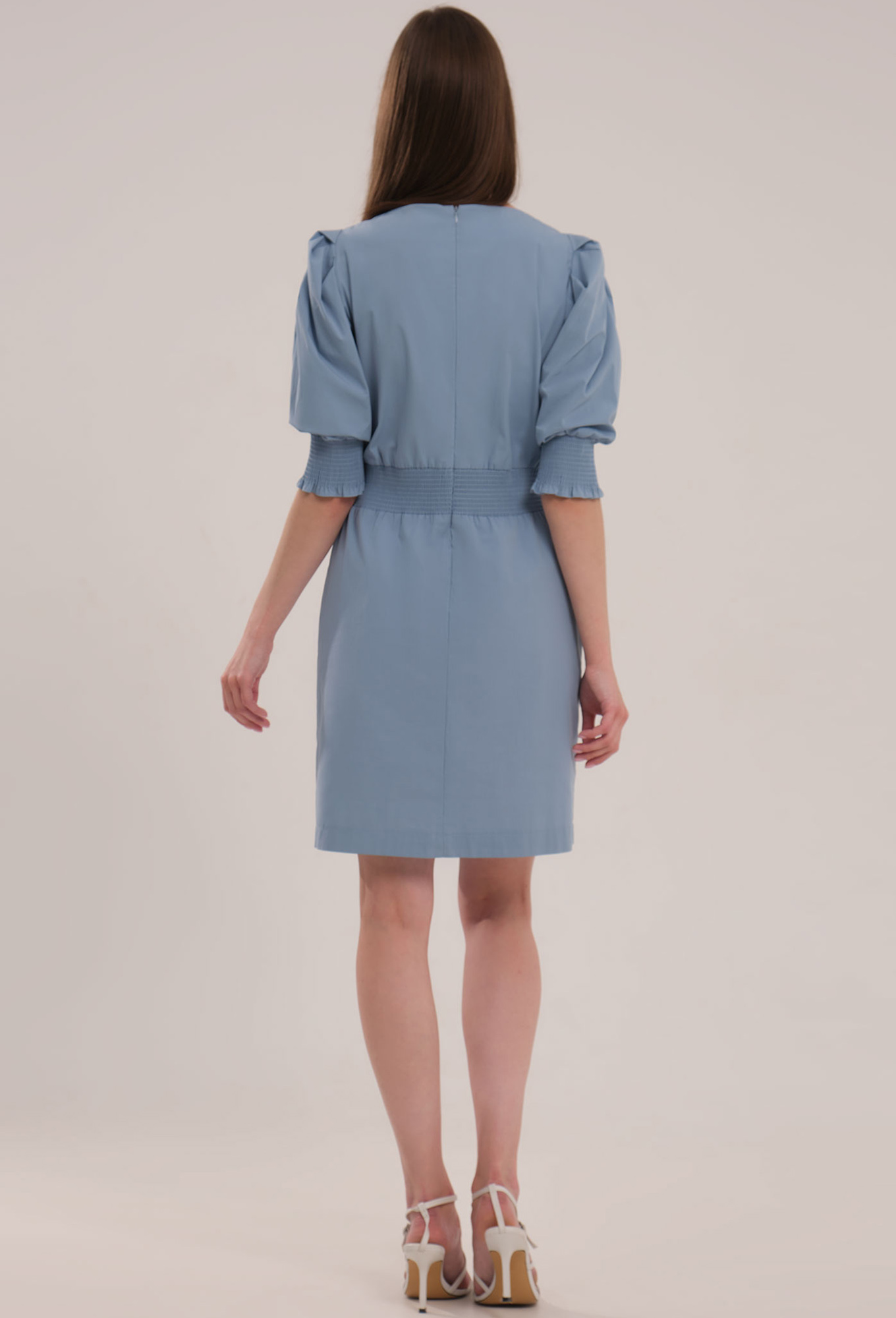 Стильное платье полуприлегающего силуэта, с резинкой на поясе. Рукава имеют резинку, рукава фонарики.