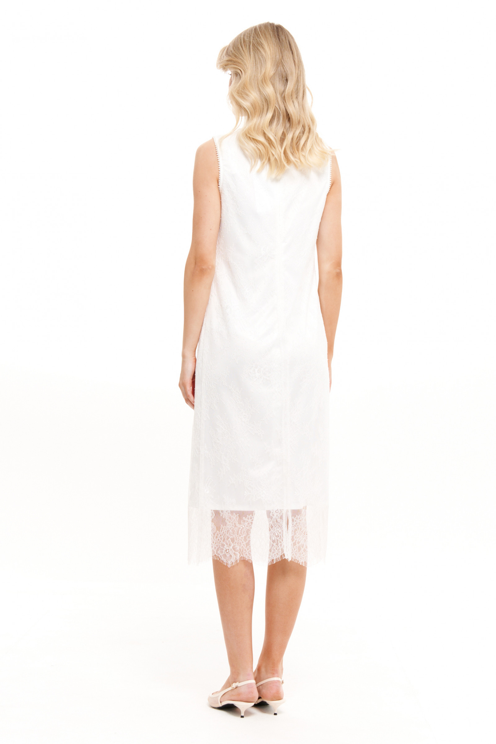 Длина миди делает платье универсальным вариантом для различных случаев – от деловых встреч до вечерних мероприятий. Оно идеально впишется в базовый гардероб, дополняя как классические, так и современные образы. Отсутствие рукавов делает его идеальным для весенне-летнего сезона, обеспечивая комфорт даже в жаркую погоду. Пройма обработана декоративной тесьмой, которая гармонично дополняет изысканную горловину, украшенную жемчужным декором.