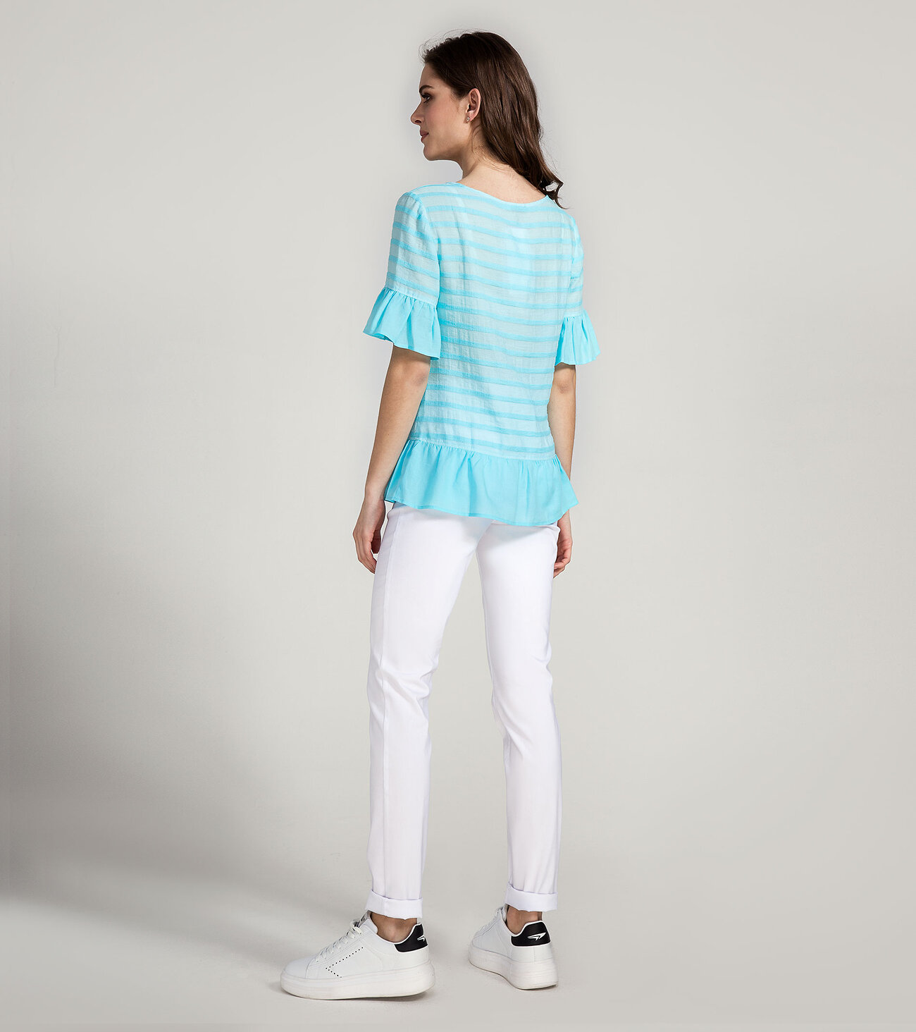 Стильная блузка из вискозной ткани. Блуза прямого силуэта по линии низа притачной волан, с круглым вырезом горловины. Спинка прямого силуэта с притачным воланом. Рукава короткие втачные с воланом. Отлично подходит для городской, динамичной жизни.Размер 42: Длина изделия - 60см, Длина рукава - 28см, Ширина плеча - 8.2см, Ширина по груди - 47см, Ширина рукава - 15.9см;