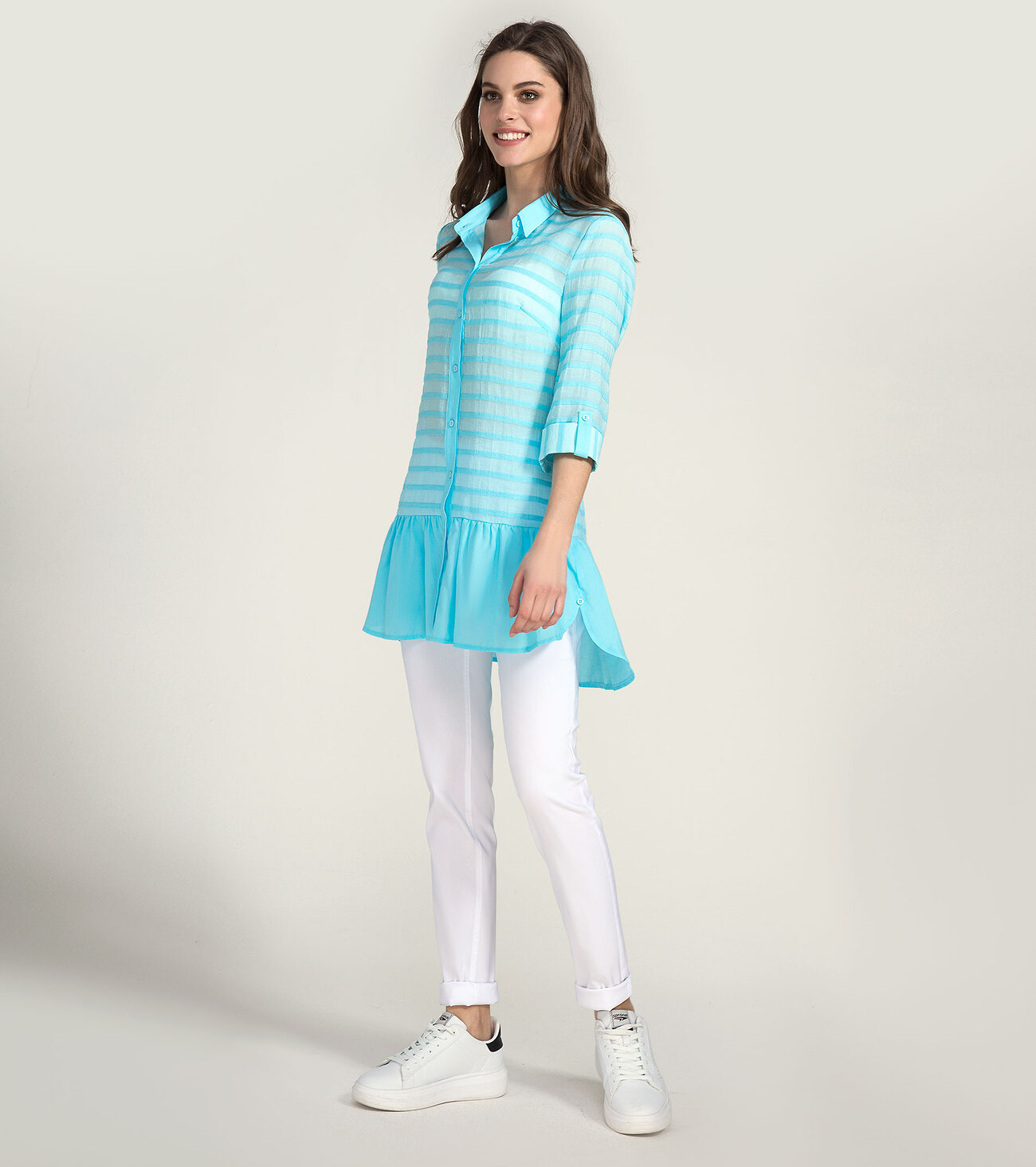 Стильная блузка из хлопковой ткани в сочитании с полоской. Блузка прямого силуэта с притачной баской по низу, с центральной застежкой на петли пуговицы, спинка прямая с баской по линии низа. Рукава втачные с манжетой и патой на пуговицу. Отличный вариант на отдых. Для контраста можно добавить аксессуары, что сделают образ еще более ярким.Размер 42: Длина изделия - 81см, Длина рукава - 39см, Обхват шеи - 43.5см, Ширина плеча - 11см, Ширина по бедрам - 50см, Ширина по груди - 46.5см, Ширина рукава - 16.5см; Бирюзовый